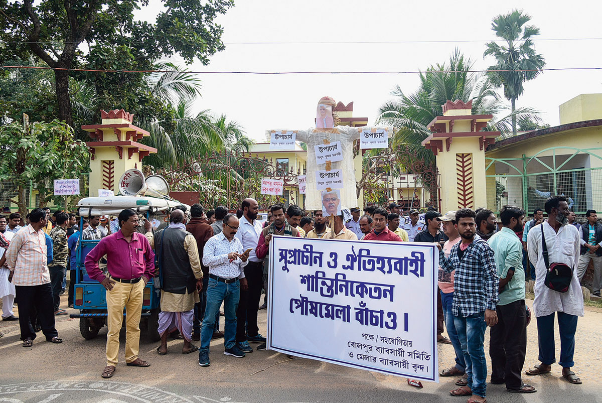Traders from Bolpur demonstrated against Visva-Bharati officials against a three-fold increase in the rent and security deposit for stalls at the Pous Mela in Dexcember, 2019.