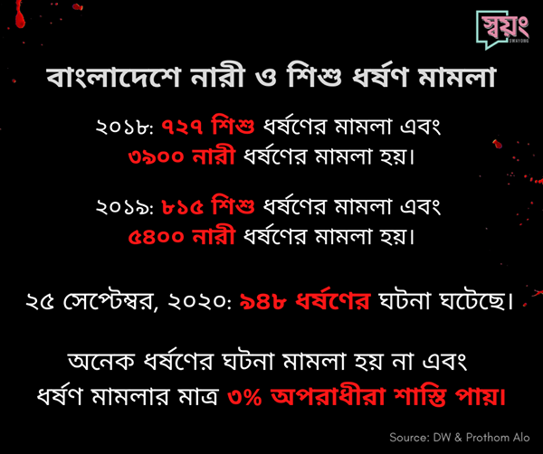 ফিন্যান্স বাংলাদেশের রিপোর্ট অনুযায়ী, ২০২০ সালে শুধুমাত্র জানুয়ারি থেকে জুন পর্যন্ত এমন ধর্ষণের সংখ্যা ৬০১! শিকার – নারী ও শিশু। শিশু মানে শুধু কন্যাশিশু না, ছেলে শিশুরাও। ঢাকা ট্রিবিউন বলছে, প্যান্ডেমিকের সময় (এপ্রিল-অগাস্ট), বিশেষত যখন কিনা লকডাউন চলছিলো, ৬৩২টি ধর্ষণের ঘটনা ঘটে, ১৪২টি ধর্ষণের চেষ্টা করা হয়, ২৯জন ধর্ষণের ফলে মারা যান বা ধর্ষণের পরে হত্যা করা হয় এবং ৫ জন আত্মহত্যা করেন। এগুলো অবশ্য শুধুই কিছু সংখ্যা, যা পুলিশ রিপোর্ট কিংবা নারী অধিকার সংস্থার মারফত পাওয়া। এর মধ্যে বিচারের আওতায় আনা হয়েছে হাতেগোনা কয়টি মাত্র। গ্রামাঞ্চলের দিকে ধর্ষণের ঘটনা ধামাচাপা দিয়ে দেওয়া হয়, অথবা ভিক্টিমের পরিবারকে টাকা দিয়ে মীমাংসা করা বা ভয়ভীতি দেখিয়ে কেস তুলে নেয়া হয়। সাম্প্রতিক সময়ে দেখা যাচ্ছে, পাহাড় থেকে সমতল, আধুনিক থেকে পর্দানশীন নারী, ২/৩ মাসের শিশু থেকে ৭০ বছরের বৃদ্ধা – কেউই পুরুষের হাত থেকে নিরাপদ নয়। অনেক ক্ষেত্রে দেখা যাচ্ছে ক্ষমতাসীন দলের ছত্রছায়ায়, বা নাম ব্যবহার করে অনেক অপরাধী পারও পেয়ে যাচ্ছে।