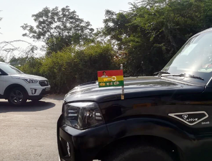 We, a team of nine members, reached village Bulgarhi around 1 pm on 9th October. Before we could pass through the police cordon and barricades, we were stopped that no more than five members can go together to meet the victim’s family. After writing applications addressed to the Sub-Divisional Magistrate in two teams of 5 and 4, we were allowed to go and meet the victim’s family. The first team was provided a police vehicle to reach the Dasya’s house, one and half kilometres away, while the second team had to walk. While the second team was waiting for the return of the first team, saffron turban cladded Akhil Bhartiya Kshatriya Mahasabha activists also arrived with posters stuck on their vehicles with message written that they were there only to meet the ‘victim’ Thakur family. They were about ten to twelve people. They argued with police to go together and after much debate, they were allowed to go together inside the village. One of the vehicles with them carried the flag of Pragatisheel Samajwadi Party, the breakaway faction from Samajwadi Party formed by Shivpal Yadav (See pictures attached).