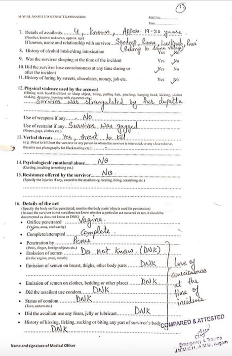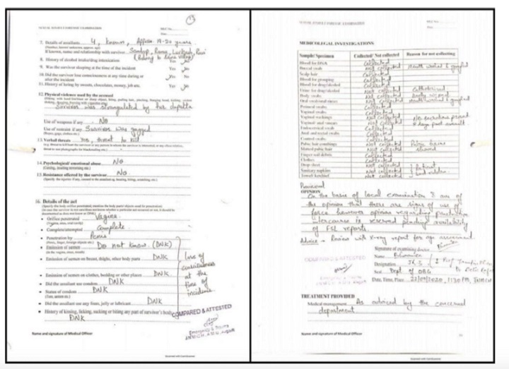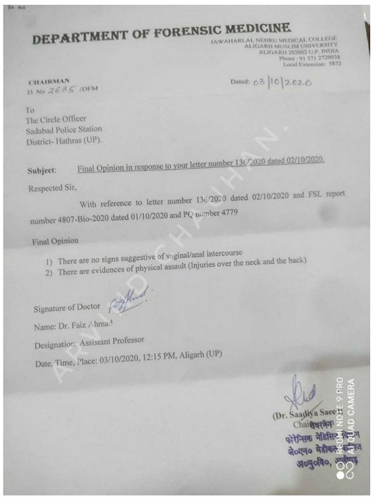 Some doctors in Aligarh were of the opinion that Dasya should not be moved till she became conscious. The family too refused, realising that it was risky to shift her far in that condition. She was in severe pain and couldn’t move her neck or back due to severe nervous injury affecting the spine. The false allegation that Dasya’s family didn’t permit the administration to take her to AIIMS does therefore stand exposed and countered. Why this allegation again? It is however, shocking that the doctors, who must have checked her whole body, didn’t examine anything related to sexual assault, nor did they enquire with her family till she herself brought out the truth. This passage, rather wastage, of time could be deliberate since late examination couldn’t ever prove rape. The intention obviously could be to miss or lose evidence forever. A copy of the Medico Legal Case report, which was not made available to the family immediately, mentions penetration of vagina by penis as well as the report from the Forensic department of the same University which rules out this possibility are attached.