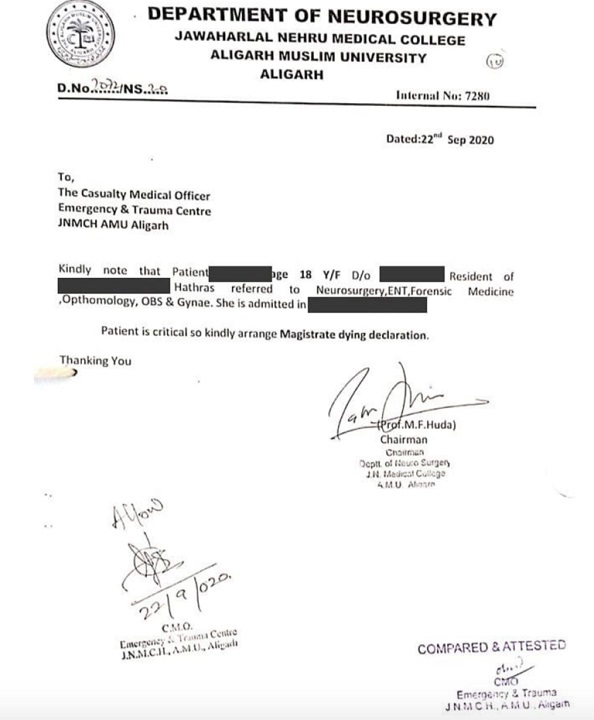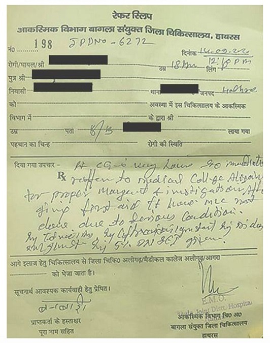 Almost nothing happened in 24 hours and she was again shifted to Aligarh hospital when she was still almost unconscious and her tongue was bitten and broken not allowing her to speak a word. It was in Aligarh JLNMCH hospital, the relatives heard, the doctors exclaiming that they didn’t know from where had the case been brought to them and for what! The family since the beginning felt that the doctors and employees there were under enormous pressure! They did give the basic treatment and everyone from the family was of course most worried about Dasya’s struggle for survival and nothing else at that moment.