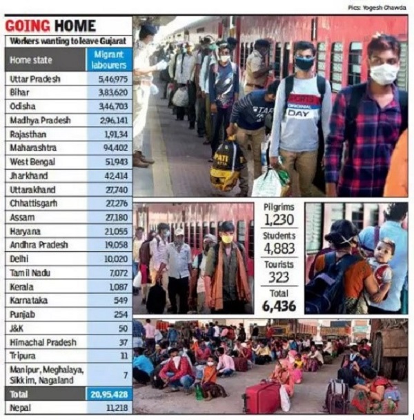 কতটা মরিয়া ছিলেন শ্রমিকরা বাড়ি ফেরার জন্য? ৩ মে টাইমস অফ ইণ্ডিয়ার রিপোর্ট জানাচ্ছে, গুজরাত থেকে বাড়ি ফেরার জন্য ২৫টি রাজ্যের ২০,৯৫,৪২৮ জন নাম লিখিয়েছেন। তার মধ্যে এ-রাজ্যে ফিরতে চেয়ে আবেদন করেছিলেন ৫১,৯৪৩ জন। রাজ্য প্রশাসনের হিসেব, ট্রেন চালু হতেই ২ মে শনিবার থেকে ৫ মে মঙ্গলবার সকাল পর্যন্ত ২৩টি শ্রমিক স্পেশাল ট্রেনে ২৮ হাজার শ্রমিক ওড়িশা, বিহার, উত্তরপ্রদেশ ও মধ্যপ্রদেশে ফিরে যান। এখান থেকে স্পষ্ট অন্যান্য রাজ্যের শ্রমিকদের মতো বাংলার শ্রমিকরা বাড়ি ফেরার জন্য কতটা ব্যাকুল ছিলেন। কিন্তু, প্রথম অবস্থায় বাংলার জন্য কোনও ট্রেনের অনুমোদন পশ্চিমবঙ্গ সরকার দেয়নি।