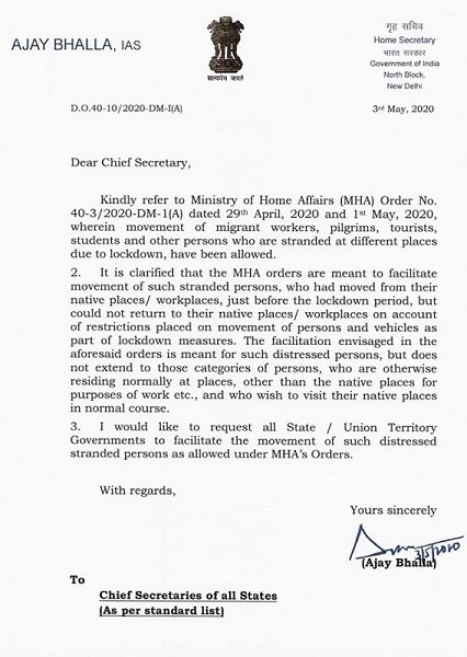 ১ মে থেকেই চালু হয়ে গেল শ্রমিক স্পেশাল ট্রেন। ৩ মে শ্রমিকদের ফিরে যাওয়ার বিষয়ে আর একদফা নির্দেশ জারি করে বসল স্বরাষ্ট্রমন্ত্রক। প্রথম দুটি নির্দেশের নিরিখে জারি করা এই নির্দেশ কেন্দ্রীয় সরকার ও শিল্পপতিদের গোপন বোঝাপড়াকেই যেন সামনে নিয়ে এল। নির্দেশের দ্বিতীয় অনুচ্ছেদে প্রথম দুই নির্দেশের ব্যাখ্যা করে বলা হয়: “প্রথম দুই নির্দেশের লক্ষ্য সেই সমস্ত আটকে পড়া শ্রমিকদের সাহায্য করা যাঁরা লকডাউনের মুখে তাঁদের বাসস্থান/ কাজের জায়গা ছেড়ে বেরিয়ে পড়েছিলেন কিন্তু লকডাউনের জন্য গাড়ি চলাচল এবং সাধারণের যাতায়তে বাধানিষেধের ফলে নিজ নিজ বাসস্থান বা কাজের জায়গায় ফিরে যেতে পারেননি। কিন্তু, (ওই নির্দেশ) তাঁদের জন্য নয় যাঁরা আদি বাসস্থানের বাইরে কর্মসূত্রে স্বাভাবিক ভাবে কোথাও বসবাস করেন এবং স্বাভাবিক নিয়মে বাড়ি ফিরতে চান।”