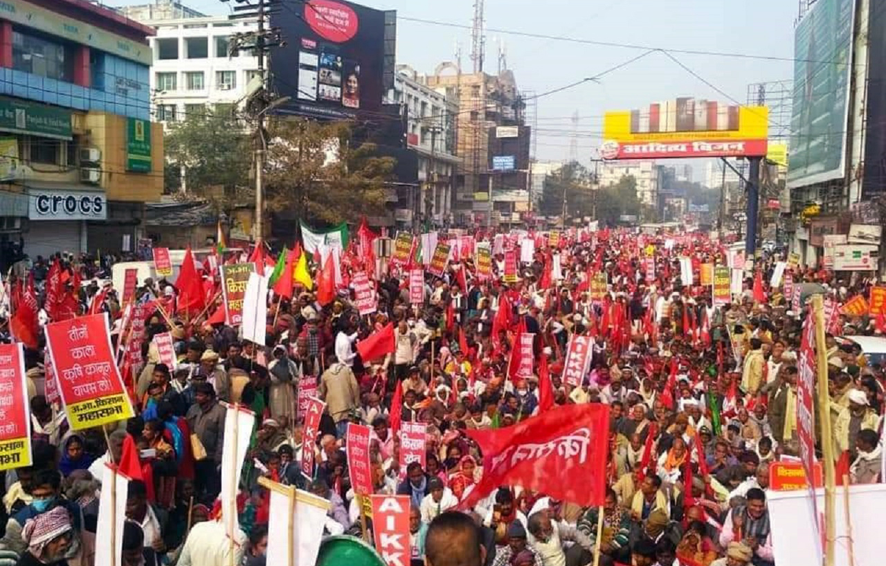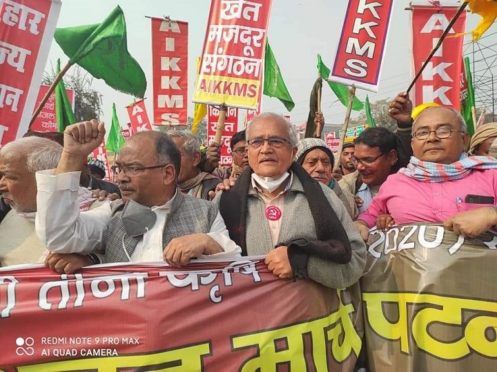 A huge procession of farmers from across Bihar gathered at the historic Gandhi Maidan in Patna, the capital of Bihar on December 29, 2020, as part of the ‘Rajbhavan Abhiyan’. The call was given by the Bihar unit of AIKSS (All India Kisan Sangharsh Samiti), comprising about 25 farmers’ organizations. Initially, mostly peasant organisations of different left parties were the main constituents, but gradually various local and issue based farmers’ associations too came under the umbrella of AIKSS Bihar unit.