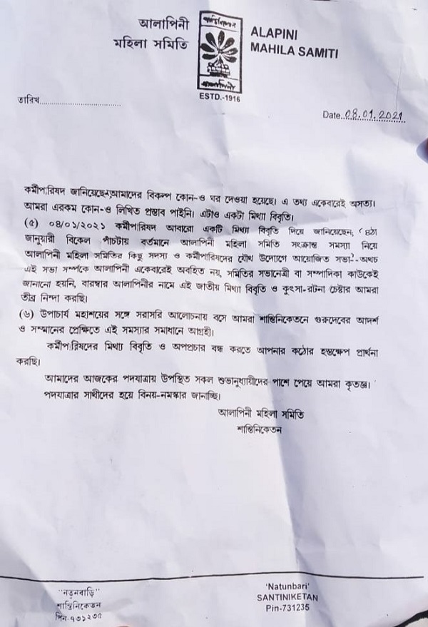 আশ্রমিক সংঘের পর এবার উপাচার্যের নজর পড়েছে আলাপিনী মহিলা সমিতির উপর। তিনি সমিতির সদস্যাদের নির্দেশ দেন ৩১ ডিসেম্বর ২০২০-র মধ্যে তাঁরা যে অধিবেশন কক্ষটি ব্যবহার করেন, তা ছেড়ে দিতে হবে। ১ জানুয়ারি তাঁদের ব্যবহৃত ঘরটি বিশ্বভারতী কর্তৃপক্ষ সিল করে দেয়। আলাপিনীর সদস্যারা প্রতিবাদ জানান। দু’দিন অবস্থানে বসেন। উল্টোদিকে উপাচার্যের নেতৃত্বে বিশ্বভারতী কর্তৃপক্ষ সমিতির সদস্যাদের নামে মিথ্যা অভিযোগ আনেন। সংবাদমাধ্যমে ভুল তথ্য পরিবেশন করেন যে, তাঁদের নাকি আলাদা ঘর দেওয়া হবে। সমিতির সদস্যারা জানিয়েছেন, এটি মিথ্যা। তাঁদেরকে কোনও নতুন ঘর দেওয়া হয়নি। শুধু তাই নয়, কর্তৃ‌পক্ষ সমিতির সদস্যাদের নামে মিথ্যা কুৎসা অবধি রটিয়েছেন। আলাপিনীর মহিলারা প্রথম থেকেই জানিয়েছেন যে, তাঁরা উপাচার্যের সঙ্গে সাক্ষাৎ করতে চান। কিন্তু উপাচার্য তাঁদের সঙ্গে কোনও সাক্ষাৎ না করেই বলেন যে, তিনি নাকি সমিতির সদস্যাদের সঙ্গে কথা বলেছেন।