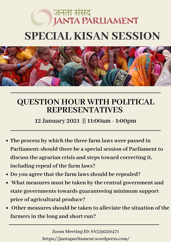 Janta Parliament (जनता संसद) was envisioned as a simulated virtual people’s Parliament session to discuss urgent Covid related policy issues. In view of the ongoing farmer agitations at various sites on state borders with Delhi, Special Kisan Sessions of the Janta Parliament were held. Today, the resolutions passed and questions raised in the earlier six sessions of the Special Kisan Session of the Janta Parliament were posed to the political parties which were represented by senior leaders from the Congress, TMC, CPI-ML, CPI, RJD, VCK, AIFB, SP and CPI (M). The session was conducted by P. Sainath, senior journalist on behalf of the presidium comprising of P. Sainath, Aruna Roy, M G Devasahayam, Annie Raja, and Thomas Franco.