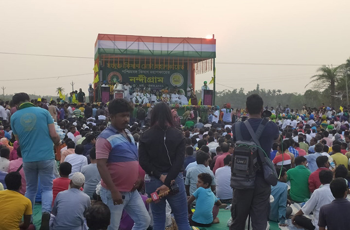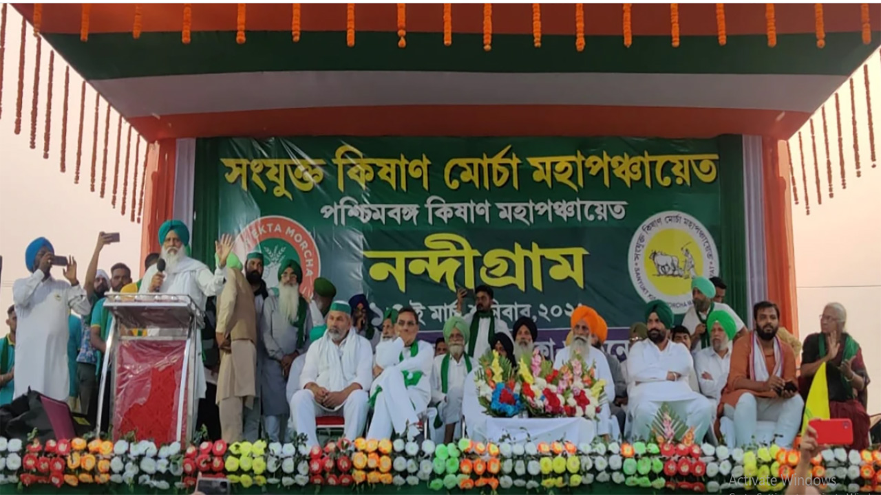 পশ্চিম উত্তরপ্রদেশে একের পর এক মহাপঞ্চায়েতে যে জাঠ কৃষক নেতারা বিজেপিকে একঘরে করে ছেড়েছেন — তার অন্যতম প্রধান নেতা রাকেশ টিকায়েত ছিলেন সভার ‘স্টার অ্যাট্রাকশন’। সে কথা বোঝা গেল তাঁর আগমনে। ঘণ্টাখানেক বাদে যাঁর গলায় শোনা যাবে সেই সামাজিক বয়কটের কথা, “ভোট তো ছোড়িয়ে, ইসবার বিজেপি কো চাউল মাঙ্গনে নেহি দিজিয়ে।” কলকাতা থেকে যাওয়া অন্তত ৫০-৬০টি গাড়ি, খান তিন-চার দূরপাল্লার বাস, স্থানীয়দের বাইক-অটোয় বার বার জ্যামজটে বন্ধ হয়ে যাচ্ছিল নন্দীগ্রাম বাসস্ট্যান্ড পরবর্তী সংকীর্ণ বাইপাস। রাকেশ টিকায়েতকে তাই কাটা ধানের উঁচিয়ে থাকা নাড়া, এবড়ো-খেবড়ো জমি ধরে সদলবলে হেঁটে আসতে হলো। সেটা বড় কথা নয় এত তাঁদের মতো কৃষকদের কাছে রুমাল-পরিমাণ জমি। মঞ্চে তখন ভাষণ দিচ্ছেন কৃষক আন্দোলনের বর্ষীয়ান নেতা সর্বজনশ্রদ্ধেয় বলবীর সিং রাজ্জেওয়াল। কারা যেন বলল, টিকায়েতজি আসছেন। আর প্রবল জয়ধ্বনিতে ফেটে পড়ল মাঠ। রাজ্জেওয়াল বক্তৃতা থামিয়ে হেসে ফেললেন।