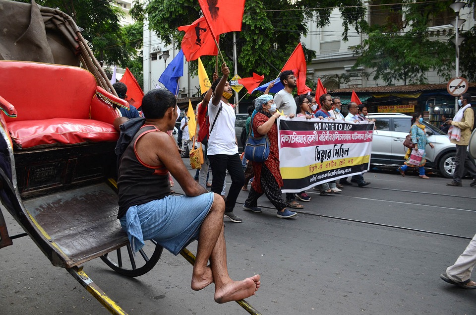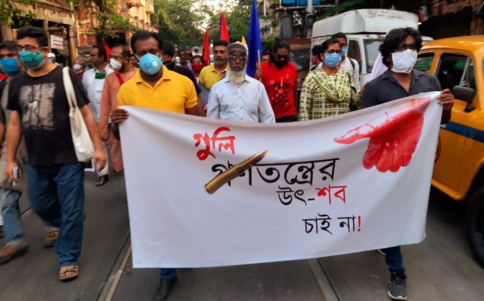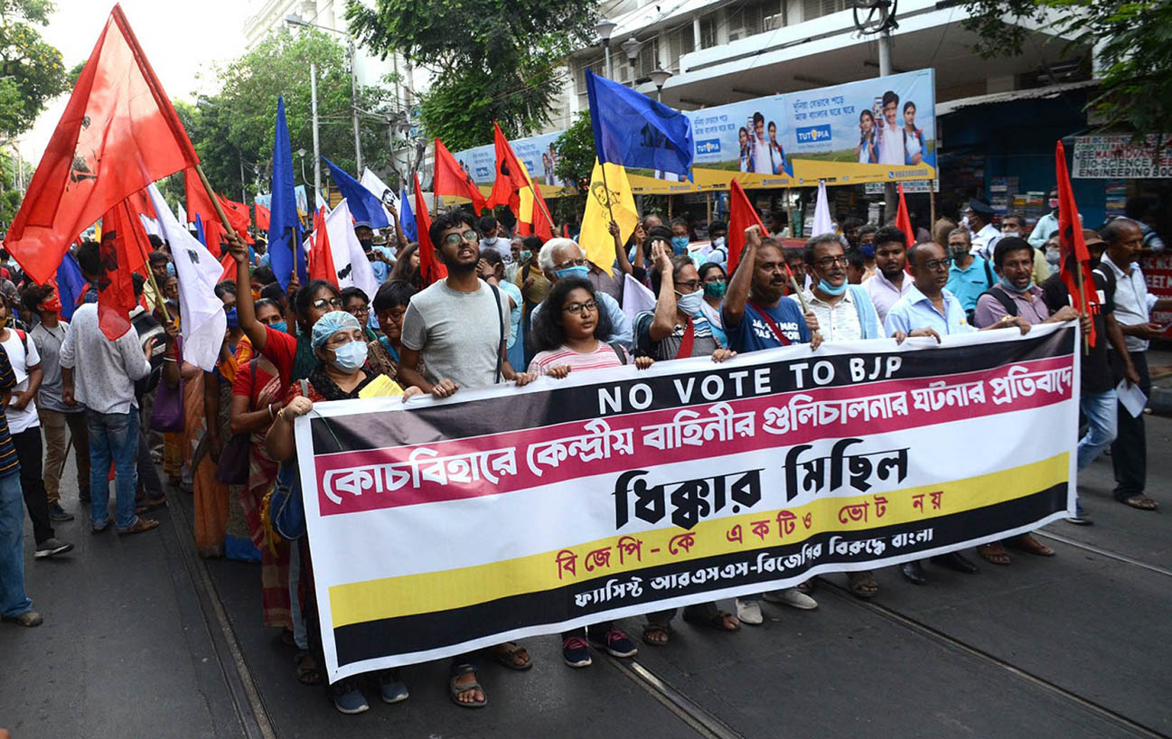 On 12 April 2021, ‘Bengal Against Fascist RSS-BJP’— a citizens platform spearheading the ‘No Vote to BJP’ campaign in West Bengal, had called a protest rally against the killings of five villagers and grievous injury to many others by the CISF Jawans in Sitalkuchi in Cooch Behar district of North Bengal. On 10 April, the central forces deployed and monitored by the Election Commission to conduct violence free polls, shot dead 4 villagers, who they alleged were part of a mob of miscreants, which tried to snatch away their weapons and tamper with the poll process.