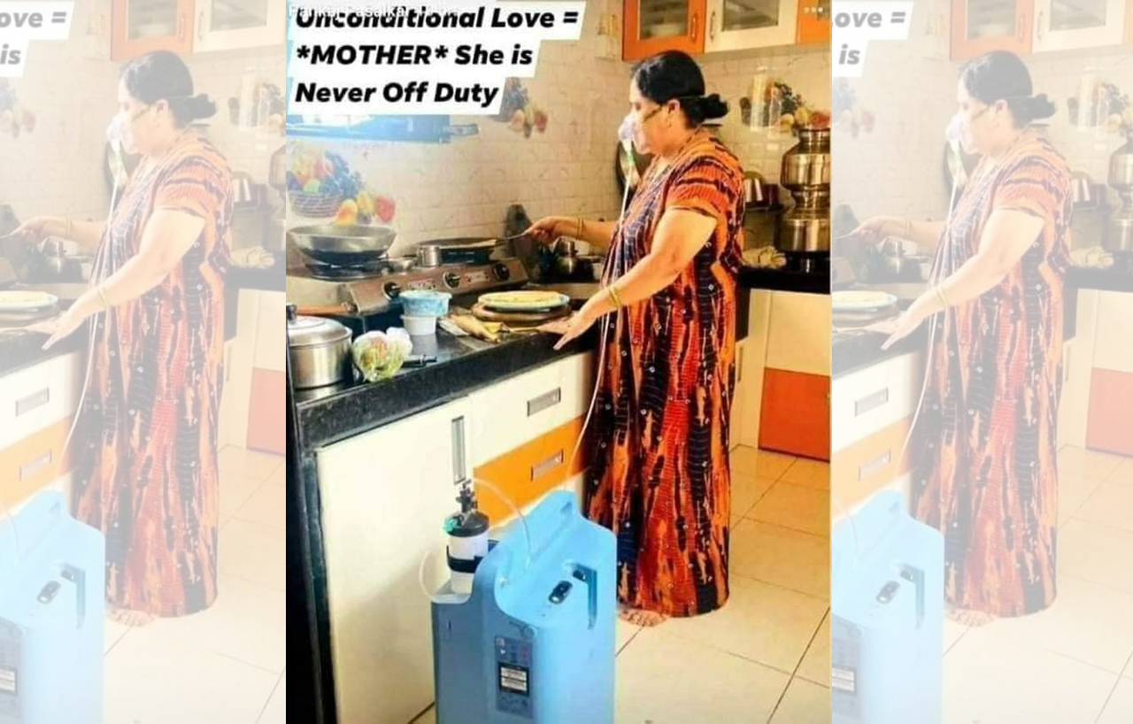সোশ্যাল মিডিয়ায় একটি ছবি ভাইরাল। অধিকাংশ মানুষই আবেগে গদগদ। এক মধ্যবয়সী মহিলা নাকে অক্সিজেনের নল লাগিয়ে রান্নাঘরে পরিবারের জন্য রান্না করছেন। সঙ্গে লেখা নিঃশর্ত ভালবাসা = *মা*, যিনি কখনোই ‘অফ ডিউটি’ নন। মাতৃত্বের কি অসাধারণ বর্ণনা। এবং মারাত্মক। বিবামিষা উদ্রেককারী। একজন মহিলা মা হওয়া মানে তাকে মহামারির সময়ে অক্সিজেনের অভাবে মুখে কৃত্রিম অক্সিজেনের নল লাগিয়েও পরিবারের মুখে খাবার তুলে দিতে হবে। এই ছবি শুধু নিষ্ঠুর ও অমানবিক নয়, এই ছবি মহিলাদের বাড়ির কাজের নামে প্রতিদিনের শোষনের ‘গ্লোরিফিকেশন’, যাতে মাতৃত্বের নামে তাদের শেষ জীবনিশক্তিটুকুও নিংড়ে নিতে পারে এই পুরুষতান্ত্রিক সমাজ। লিখছেন সুদর্শনা চক্রবর্তী।
