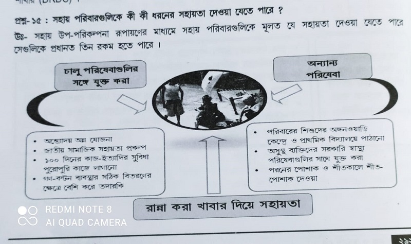 বিশেষভাবে ‘সহায় প্রক্রিয়া ও কর্মসূচি’ নিয়ে এগিয়ে এলে গণ-রান্নাঘর থেকে পোশাক-আশাক, পানীয় জল থেকে প্রয়োজনীয় ওষুধের ব্যবস্থা করা যেত। প্রয়োজন মনে করলে তার সঙ্গে জুড়ে নিতেই পারত স্বেচ্ছাসেবীদের। গ্রামের অতিদুঃস্থ বা সহায়-সম্বলহীন এবং কর্মক্ষমতাহীন পরিবারগুলির সুস্থভাবে বেঁচে থাকার জন্য ন্যূনতম খাবার, পোশাক, বাসস্থান, কাজের উপায়, ও অন্যান্য ন্যূনতম পরিষেবা সুনিশ্চিত করার জন্য পশ্চিমবঙ্গ সরকারের এক উদ্যোগ হল সহায় প্রক্রিয়া ও কর্মসূচি। (সূত্র:গ্রাম পঞ্চায়েতের প্রধান এবং উপ-প্রধানদের প্রশিক্ষণ উপলক্ষে পাঠোপকরণ, ২০১৫)। বিষয়টি বুঝতে আমরা পঞ্চায়েতের উপরোক্ত প্রশিক্ষণগ্রন্থ থেকে তিনটি ছক তুলে দিচ্ছি। যাতে একনজরে কিছু বোঝা যায়। আর কম পরিশ্রমে বোঝানোও যায়। ২৩টি প্রশ্নোত্তরের মাধ্যমে কর্মসূচির খুঁটিনাটি লিপিবদ্ধ করা আছে ওই বইয়ে।
