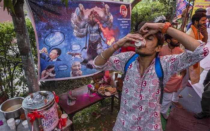 মিডিয়া রিপোর্ট থেকে জানা যাচ্ছে, প্রধানমন্ত্রী মোদীর নিজ রাজ্য গুজরাতে বিশ্বাসী হিন্দুরা সারা শরীরে গোবর ও গোমূত্র মেখে ‘ইমিউনিটি’, অর্থাৎ শরীরের রোগ প্রতিরোধ ক্ষমতা বাড়াচ্ছে, এবং করোনাভাইরাসের আক্রমণ থেকে রক্ষা পাবার চেষ্টা করছে। হিন্দু মহাসভার প্রধান বিজেপির কাছের লোক এবং নিজেও চরমপন্থী হিন্দুত্ববাদী। তিনি করোনাভাইরাস ‘তাড়াতে’ এবছর মার্চ মাসে নিউ দিল্লীতে একটি গোমূত্র পান অনুষ্ঠানের আয়োজন করেন।