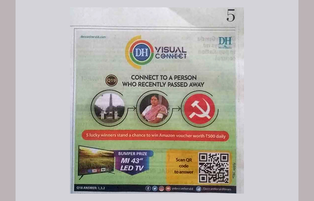 The Network of Women in Media, India (NWMI) — a country-wide network of media professionals – also wrote to the editor of DH saying that “It was with shock that we opened the Deccan Herald this morning to find on Pg 5 an extremely objectionable advertisement for DH Visual Connect for the purpose of winning vouchers on Amazon or a 43” LED TV. The visuals in the ad, the first of the memorial for the fallen soldiers who fought in the battle of Bhima Koregaon; the second of Advocate Sudha Bharadwaj, an accused in the ‘Bhima Koregaon case’; and the third the logo of the Communist Party of India (Marxist) encourage the readers of your esteemed paper to literally make connections that do not exist.” NWMI argued DH that “instead of providing the so-called ‘correct answer’ in the designated space in tomorrow’s newspaper, an apology and retraction would send a strong signal of the high traditions to which your esteemed newspaper adheres and to which its readers look forward.”