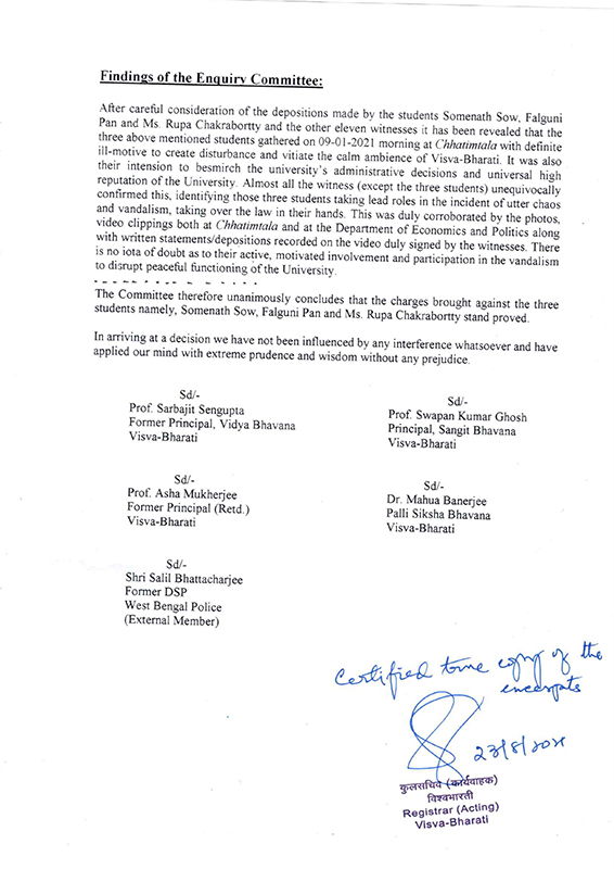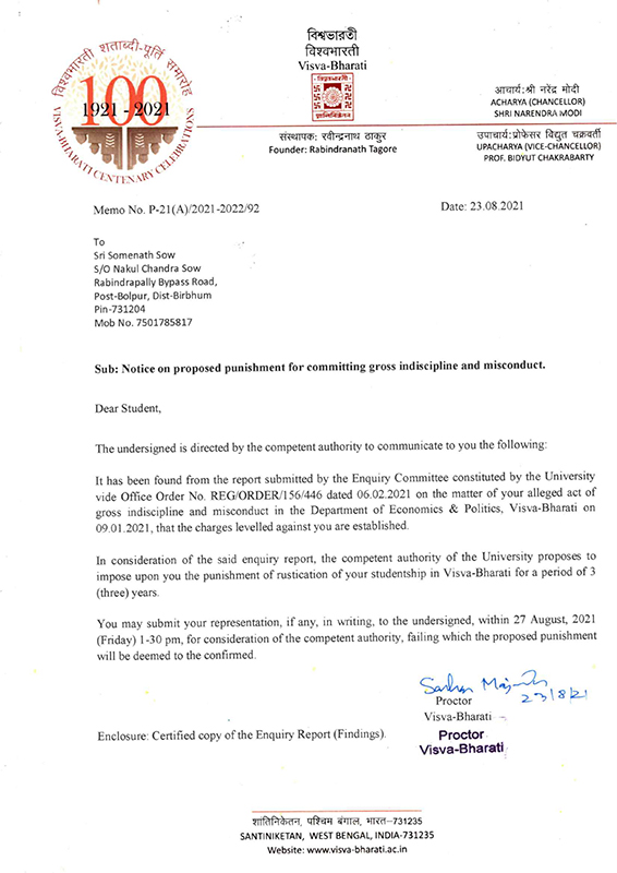 তদন্ত কমিটির রিপোর্টটি ছাড়াও আমাদের হাতে এসেছে তিন জন শিক্ষার্থীর মধ্যে একজন স্নাতক স্তরের তৃতীয় বর্ষের সোমনাথ সো-এর বরখাস্তের চিঠিটি। যোগাযোগ করেছিলাম তাঁর সঙ্গে। তিনি বলেন, “১৪ জানুয়ারি আমাদের প্রথম সাসপেন্ড করা হয়েছিল। আমরা তিন বছর ধরে ছাত্রছাত্রীদের বিভিন্ন দাবি নিয়ে ক্রমাগত আন্দোলন করে গেছি। উনি (উপাচার্য) কোনও রকম দাবি শোনারও প্রয়োজন মনে করেন না, ছাত্রদের সঙ্গে কথা বলারও প্রয়োজন মনে করেন না। উল্টে ছাত্রদের পেছনে গুন্ডা লেলিয়ে দিয়ে মার খাইয়েছেন। বিভিন্ন সময়ে আমাদের বিরুদ্ধে নানা ষড়যন্ত্র করেছেন, যার ফল আমাদের বহিষ্কার করা। আমরা অবশ্যই চুপচাপ এটা মেনে নেব না। আমাদের আইনি পরামর্শদাতা আইনজীবীরা রয়েছেন, তাঁদের মাধ্যমেই আমরা আইনি লড়াই লড়ব। এখানে উপাচার্যর অনৈতিক কাজকর্ম কিছুটা হলেও যারা আটকাতে পেরেছে তারা হল ছাত্রছাত্রীরাই। এখানে যদি ওঁকে টিকে থাকতে হয় ছাত্রছাত্রীদের শায়েস্তা করতেই হবে। সেইজন্যই আমাদের বিরুদ্ধে একটা মিথ্যে অভিযোগকে নাটকীয় আকারে সাজিয়ে ষড়যন্ত্র করে এটি করলেন। তদন্ত কমিটি তৈরি হলে তারা তো অভিযুক্তদের বিরুদ্ধে একটা চার্জশিট দেবে। সেই চার্জশিটই তারা আমাদের বিরুদ্ধে দিতে পারেনি, তাহলে কী করে আমাদের দোষী সাব্যস্ত করছে? আমরা দেখেছি অর্থনীতি বিভাগের অধ্যাপকদের ছ’ঘন্টা বন্দি করে রেখে সাসপেনশন, চাকরি চলে যাওয়ার ভয় দেখিয়ে উনি (উপাচার্য) আমাদের বিরুদ্ধে জোর করে একটা রেজুলিউশন নিয়েছিলেন। এরপর যে এনকোয়ারি কমিটি তৈরি করেন, তার প্রায় সকলেই দুর্নীতিগ্রস্ত আর তাঁরা কোনও সিদ্ধান্ত জানানোর আগেই উনি বলে দিয়েছিলেন যে এদের সাসপেন্ড করা হয়েছে আর কিছুদিন পর আমি বহিষ্কারও করে দেব। সুতরাং এই তদন্ত কমিটি বসানোটাও পুরোপুরি লোক দেখানো, ওঁর পছন্দের লোকজনদের নিয়ে তৈরি যাতে ওঁর ইচ্ছে মতো রিপোর্ট তৈরি হয়। এঁরা অনেকেই আমাদের বিরুদ্ধে বিভিন্ন অনলাইন পিটিশনে সই করেছেন আগেই। তাই শুরু থেকেই জানতাম কোনও নিরপেক্ষ তদন্ত হবে না, পুরোটাই উপাচার্যর নির্দেশে হবে।”