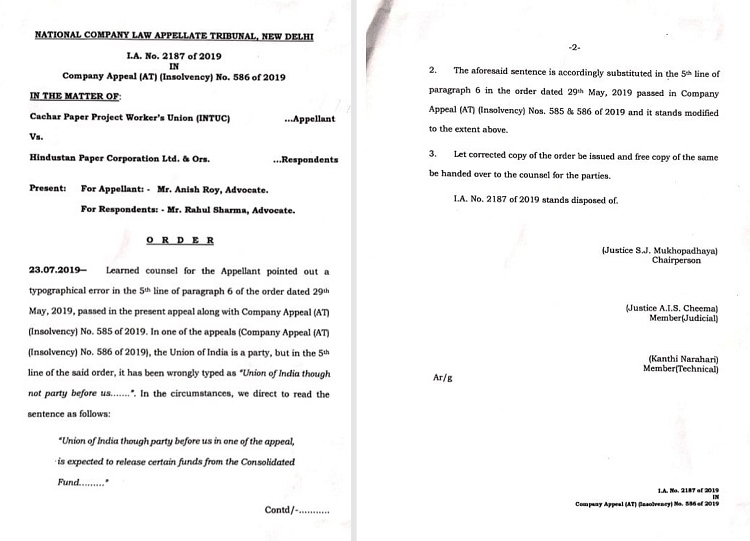 Following an appeal made by the workers’ union before the tribunal, in a modified order, the NCLAT included the Union goverment as ‘party’ in its appeal made before the court and directed the Centre to initiate immediate necessary action to ensure HPCL Paper Mills as a ‘going concern’, and release all pending salaries and statutory dues of the workers. The liquidator was asked to approach the government for the realisation of funds for this purpose.