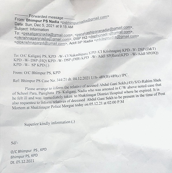 7 December 2021: Manab Adhikar Surakha Mancha (MASUM), a human right organisation in West Bengal, has brought to public notice and attention, a case of unnatural death in police custody of a marginalised Muslim migrant labour, Abdul Goni Sekh (43 years), from Panighata Purbapara under Kaliganj Police station area in Nadia district of West Bengal. Abdul Sekh was arrested on 04.12.2021 by the Bhimpur police station of Nadia district with allegations of using fake currency notes. The police visited the house of Abdul Sekh in Panighata at around 3:00 am on 5.12.21 and informed his family that he is ill and has been admitted to Shaktinagar District Hospital. On the same day the family was informed about the death of Abdul Sekh at around 7:30 am by police.