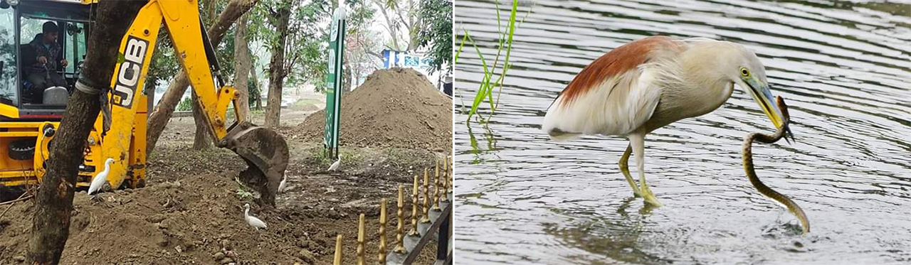 সকলের অলক্ষ্যে পুকুরটি বোজানোর জন্য প্রথমেই বড় রাস্তার ধারের দেওয়াল ভেঙে ভিতরে যাওয়ার আলাদা রাস্তা বানানো হয়, ধীরে ধীরে দেওয়াল সংলগ্ন পুকুরের অংশে মাটি ফেলা শুরু হয় এবং রাতের অন্ধকারে পুকুরের জল পাম্প করে বাইরে বার করার কাজ চলতে থাকে প্রায় এক মাস ধরে৷ এ ভাবে পুকুরটির প্রায় ৮০ শতাংশ বুজিয়ে ফেলা হয়েছে মাসখানেক আগেই, বাকি পুকুরটিকে ধীরে ধীরে বোজানোর কাজ চলছিল বেশ কিছুদিন ধরে৷ হঠাৎ করেই কাজের গতি বাড়িয়ে গত এক সপ্তাহের মধ্যে অন্য একটি পুকুর সম্পূর্ণ বুজিয়ে ফেলা হয়৷ এই মূহূর্তে সমগ্র মাঠে রোলার চালিয়ে, ঘাস তুলে, বালি ফেলে, বেশ কিছু গাছ কেটে ডুমুরজলাকে ধ্বংস করে দেওয়ার কাজ এগিয়ে চলেছে দ্রুতগতিতে৷