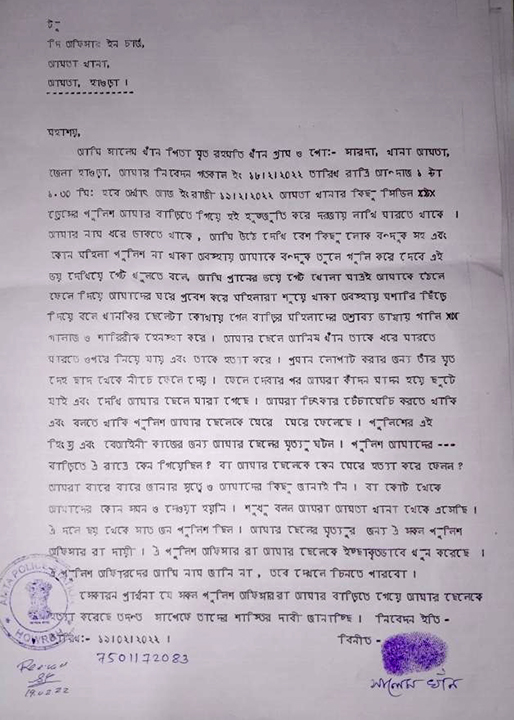 Salem Khan, father of Anish, lodged an FIR on 19.02.2022 in the Amta Police Station, holding the persons dressed as policemen responsible for killing his son. He wrote, “They deliberately killed my son. I don’t know their names, but will surely recognize them.” As per the FIR, “a few persons dressed as civic police from Amta Police station began to  create a ruckus outside our house, they started kicking at our main door, and were calling me by yelling my name. I woke up hurriedly, and saw a few persons dressed in civic policemen’s dresses, armed with guns, and with no woman police, threatening to shoot me down if I didn’t open the door. Scared of my life, I opened the door and they barged inside, pushing me down. They tore down the mosquito net, where the women of the house were sleeping, and kept abusing and asking where Anish was. They were using highly indecent language and even physically assaulted our women. Finding Anish, they dragged him upstairs, repeatedly thrashing him, and killed him. To hide evidence, his body was thrown down from the roof. Crying and shouting we ran and found our son dead.”