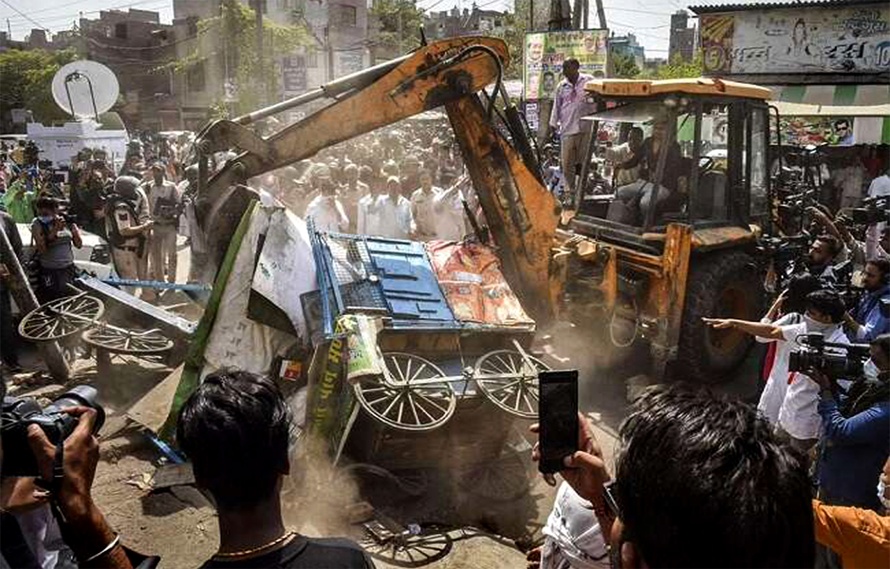 ক্ষমতা করায়ত্তের আগে বাবরি মসজিদ ধ্বংসের মধ্য দিয়ে হিন্দুত্ববাদী একাধিপত্যের যদি এক সূচনা হয়, ক্ষমতা দখল করার পর গো-হত্যা বন্ধের নামে মুসলমান, দলিতদের অর্থনৈতিকভাবে পঙ্গু করে দেওয়া, ভাতে মারা আরও এক সূচনা বিন্দু। তারই পথ ধরে স্বাভাবিক গতিতেই এসেছে লাভ জিহাদ, হিজাব নিষেধাজ্ঞা, মাংস বিক্রিতে নিষেধাজ্ঞা, হিন্দু প্রধান এলাকায় বা মন্দিরের সামনে ফল-সবজি বিক্রির বিরুদ্ধে সঙ্ঘী ফরমান জারি, হালাল বিতর্ক থেকে আজানে মাইক ব্যবহারের বিরুদ্ধে চরম বিরোধিতা। অতঃপর বুলডোজার নেমে এল পবিত্র রমজানে। আর আমরা জড়িয়ে পড়লাম উচ্ছেদের আইনে। ঠিক কোন আইনে, কত ধারায়, কতদিনের জন্য নোটিস জারি করা উচিত সেই আইনি কচকচিতে। সরকার, আইনসভা, আমলা, পুলিশ যদি আইন অনুযায়ী কাজ না করে তবে নাগরিকের শেষ আশ্রয় আদালত। এ ক্ষেত্রে সুপ্রিম কোর্টে আবেদন আমাদের দুটো বিষয়কে ফের জলের মতো পরিষ্কার করে দিল। এক, ক্ষমতাশালীরা দেশের শীর্ষ আদালতের রায় লঙ্ঘন করার স্পর্ধা রাখে। দুই, রাস্তায় বুক পেতে না দাঁড়ালে—সুপ্রিম রায়ের বলে হলেও—এই বুলডোজার গণতন্ত্রকে রোখা যাবে না। সিপিআই(এম) নেত্রী বৃন্দা কারাত, বাম কৃষক নেতা হান্নান মোল্লা, সিপিআই (এমএল) নেতা রবি রাই-দের বুলডজারের সামনে দাঁড়িয়ে পড়া সাধুবাদ যোগ্য সন্দেহ নেই। এবং এই প্রতিস্পর্ধার রাজনীতিই কাম্য। সংবিধানকে, দেশীয় ও আন্তর্জাতিক আইনকে, মানবাধিকার সনদকে, ভয়হীন বাচা, বেঁচে থাকার অধিকারকে, আদালতের রায়কে যখন রাস্তায় পড়ে থাকা কাবারির স্তূপের মতো, আবর্জনার মতো, তথাকথিত বেআইনি গুমটি দোকানের মতো বুলডোজার চালিয়ে সাফ করে দেওয়া হয়—তখন বুলডোজারের মুখে দাঁড়ানো অবশ্যই এক রাজনৈতিক কর্তব্য। তবে, এ যে তথাকথিত বেআইনের বিরুদ্ধে পুর কর্তাদের আইনি পদক্ষেপ নয়, এ এক ঘৃণ্য নাজি অভিসন্ধি, সে কথাও প্রয়োজনে আদালতের সওয়াল জবাবে তুলে ধরাটাও আজ জরুরি রাজনৈতিক কাজ। বুলডোজার-বাবা বলে খ্যাত যোগী আদিত্যনাথ কিংবা মধ্যপ্রদেশের মুখ্যমন্ত্রী শিবরাজ চৌহান হোক বা উত্তর দিল্লির পুর নিগম তারা সুকৌশলে এই একটিই ষড়যন্ত্রে সামিল। যাদের মাথায় রয়েছেন মোদী-শাহ জুটি।