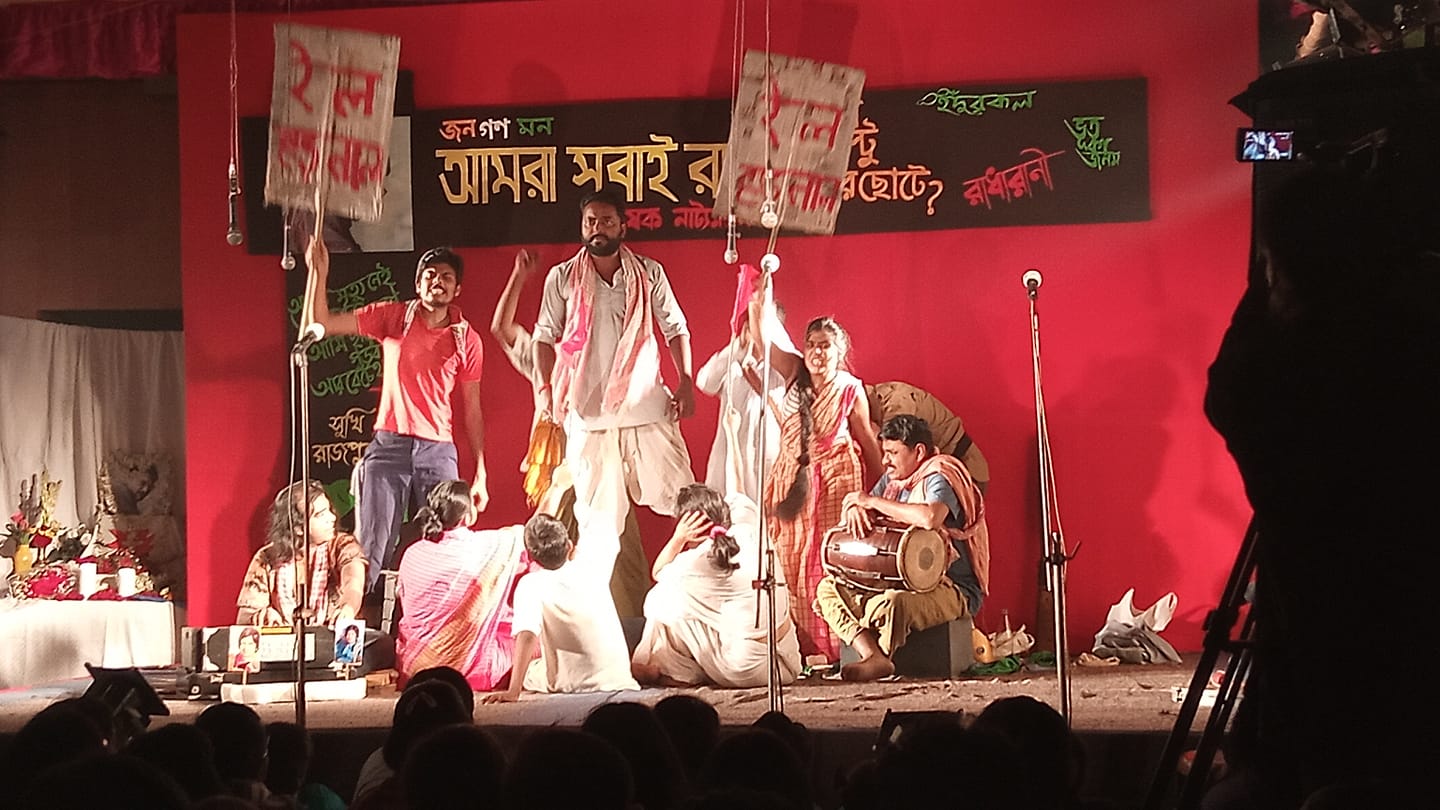 নাটকে আছে হারমোনিয়াম-মেলোডিকা-ভায়োলিন তিন বাজনা আর গানের এফেক্ট। যে এফেক্ট আনন্দ-দুঃখ-যন্ত্রণা-যৌথতাকে টানটান করে টিউনে বেঁধে রাখে। লোকসঙ্গীতের গা বেয়ে ঘাম-রক্ত-শ্রমের সার টের পাওয়া যায়। ছাদ পেটানো থেকে ভারি মাল নামানো-ওঠানো – সুর-শব্দ-কথা হয়ে প্রকাশ পায়। মিল মহল্লায় ছিন্নমূল মানুষের জীবন গ্রাম-শহরের মাঝে লুম্পেন-অলুম্পেনের জাঁতায় পড়ে মূলধারার বাণিজ্যিক সিনেমার আলোআঁধারি স্বপ্ন হয়ে আধভাঙা হিন্দি গানে ঢাকা পড়ে।