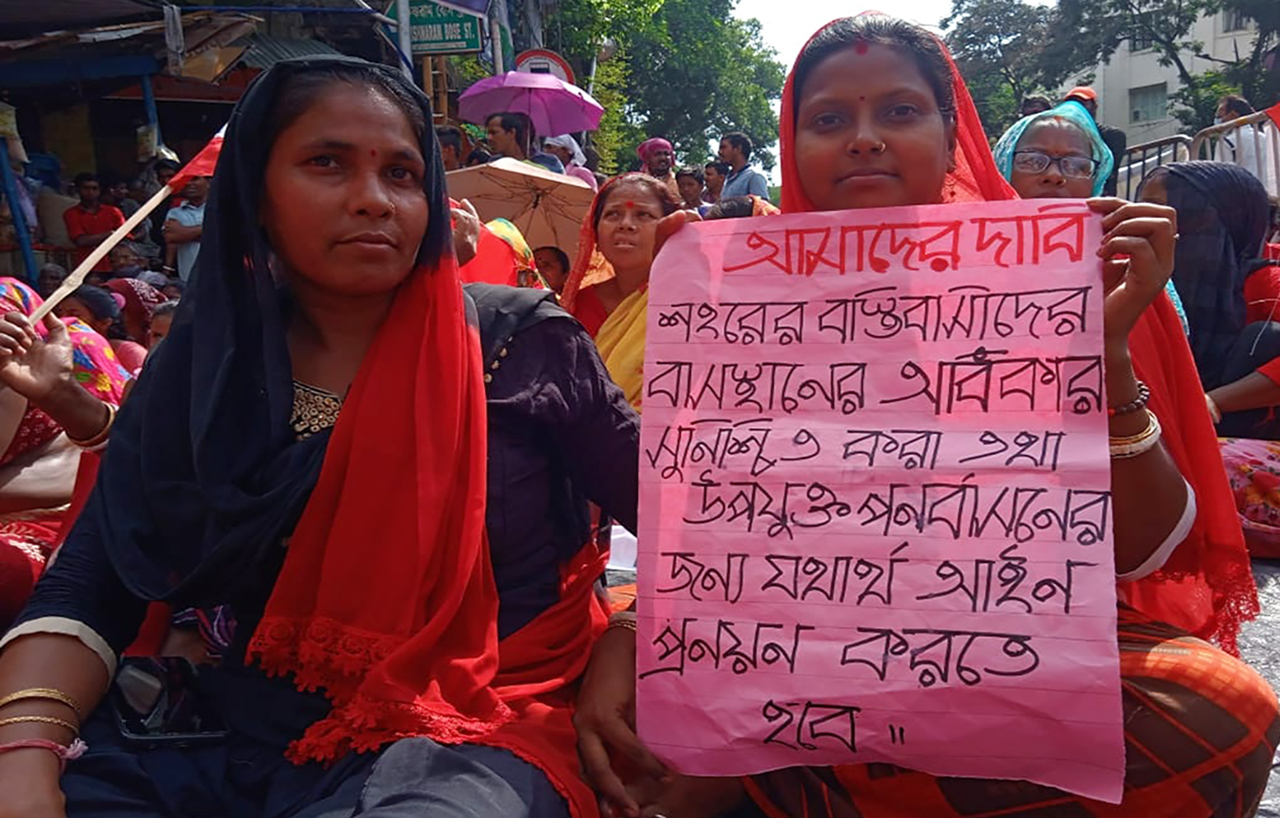 কলকাতা শহর এবং পশ্চিমবঙ্গে জুড়েই কোনও সঠিক পুনর্বাসন আইনের রুপরেখা না থাকায় উচ্ছেদের শিকার হওয়া বস্তিবাসী শ্রমজীবী মানুষকে কোনরকম নাগরিক অধিকার ছাড়াই দশ ফুট বাই দশ ফুটের ‘জতুগৃহ’-এ বসবাস করতে বাধ্য হতে হয়।