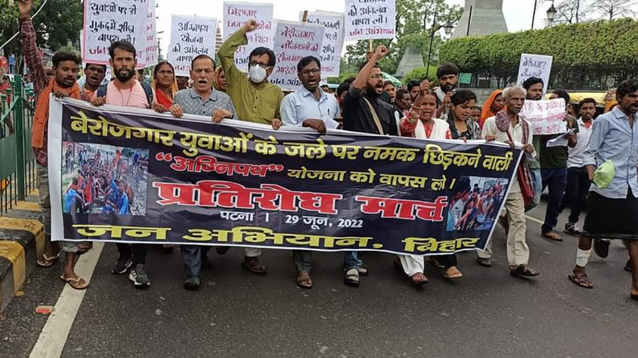 On the same day, on the call of ‘ALL India Railwaymen’s Federation’ East Central Railway Karmchari Union also protested against the Agnipath scheme at Patna junction. ‘Jan Abhiyan’, a joint forum of more than dozen democratic organisations took out a march from Patna Junction to Radio station shouting slogans against the scheme. Prominent civil society members of Patna participated in the procession.