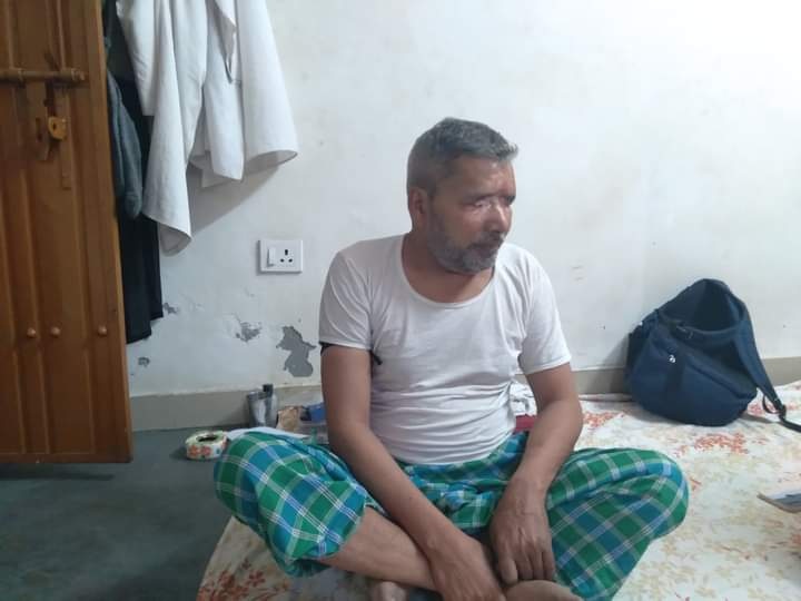 When we met him in Shiv Vihar, it was about twelve in the noon. His wife was running a grocery shop on the ground floor. In the upper-storey, her husband sat motionless and speechless. He resembled a statue.