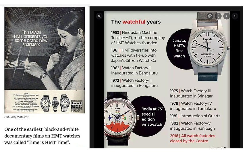 সময়টা ৫০’ এর দশকের প্রথম ভাগ। দেশ স্বপ্ন দেখছে এক স্বনির্ভর ভারতবর্ষের। ১৯৫৩ সালে ভারি যন্ত্রপাতি তৈরির জন্য প্রতিষ্ঠিত হল হিন্দুস্তান মেশিন টুলস (এইচ এম টি)। নতুন যুগের দাবি মেনে বিষয়টা আর ভারি যন্ত্রপাতির মধ্যে সীমাবদ্ধ থাকল না। সিদ্ধান্ত হল ট্র্যাক্টর, প্রিন্টিং মেশিনারি ও ঘড়ি তৈরি করা হবে। কিন্তু ঘড়ি তৈরির উপযুক্ত প্রযুক্তি তখন দেশে নেই তাই গাঁটছড়া বাঁধা হল জাপানের ঘড়ি সংস্থা সিটিজেন কোম্পানির। ১৯৬১ সালে শুরু হল ঘড়ি কোম্পানি হিসাবে এইচ এম টির পথচলা। কোম্পানির প্রথম ঘড়ির মডেলের নাম জনতা, উদ্বোধন করেন স্বয়ং প্রধানমন্ত্রী জওহরলাল নেহেরু। প্রথম ঘড়ির কারখানা ব্যাঙ্গালোরে।তারপার থেকে দীর্ঘদিন শুধু সাফল্যের গল্প। তরুণ, নূতন, প্রিয়া, নিশান, কোহিনূর – একের পর এক মডেল বাজারে অভূতপূর্ব জনপ্রিয়তা অর্জন করল। এক প্রবীণ ঘড়ি সংগ্রাহকের মতে বাজারে সবচেয়ে চাহিদা ছিল কাঞ্চন মডেলটির, তখনকার দিনে দ্বিগুন মূল্যে কালোবাজারে এই ঘড়িটি বিক্রির নজির আছে। দক্ষ কর্মীদের সৌজন্যে হাত ঘড়ির প্রযুক্তিগত উন্নতিও কম হলো না।দম দেওয়া ঘড়ি, অটোমেটিক, কোয়ার্টজ, ঘড়িতে দিন ও মাস দেখার ব্যাবস্থা, ব্রেইল ওয়াচ – সব কিছুতেই এইচ এম টি ঘড়ি তখন এক নম্বরে। বাজারের চাহিদা মেটাতে শ্রীনগর, টুমকুর, উত্তরাখণ্ডে নতুন কারখানা তৈরি হল। তাতেও কিন্তু প্রথমে ক্রেতারা দোকানে গেলেই ঘড়ি পেত না, অপেক্ষা করতে হত। জন্মদিন, বিয়েবাড়ির প্রীতি উপহার বা ফেয়ারওয়েলের অনুষ্ঠান এইচ এম টির ঘড়ি ছাড়া সম্পূর্ণই হত না।