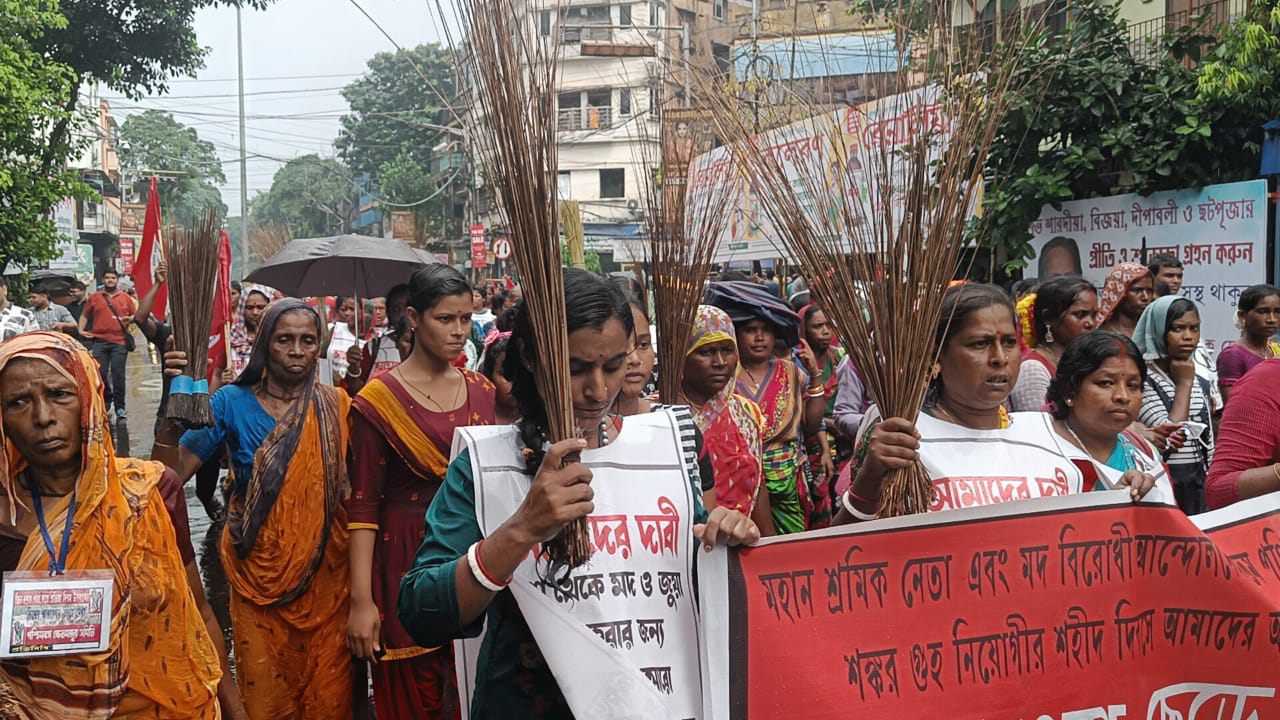 In Kolkata and Puruliya town, on 28th September from 1 PM onward , women armed with brooms marched to the Excise Department demanding a stop to the rampant misuse of liquor in the state. Their slogans reverberated on the streets of these two cities – “Mod Hatao, Desh Bachao” (Remove Liquor, Save the Country) and “Mod, Juwa, Phor, Jhentia Bidai Kor” (Use Your Brooms To Sweep Away Liquor and Gambling).