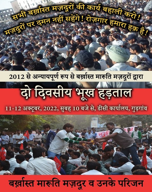 Today the dismal situation prevailing from Gurgaon to Bawal is nothing but another face of this atrocity. To break this cycle of repression, we terminated workers of Maruti have come to Gurgaon from our villages and homes, and are holding a two-day hunger strike at the Gurugram DC office on 11-12 October. We appeal to all our fellow workers, all workers’ organisations and concerned citizens to join us in this struggle.