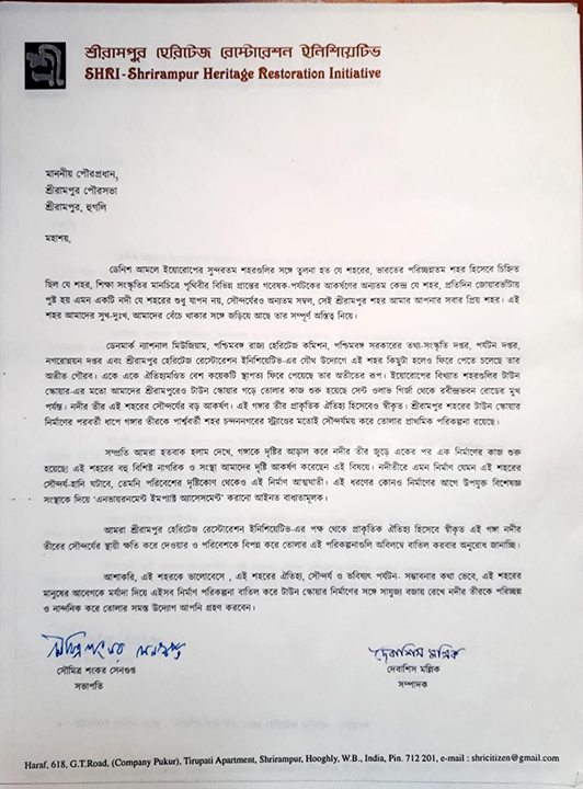 সম্প্রতি পুরপ্রধানকে শ্রীরামপুরের ডেনিশ ইতিহাসের ঐতিহ্য এবং ডেনমার্ক ন্যাশনাল মিউজিয়াম এবং রাজ্য হেরিটেজ কমিশন, তথ্য-সংস্কৃতি, নগরোন্নয়ন, পর্যটন দফতরের উদ্যোগে অতীত গৌরব ফেরানোর চলমান কর্মকাণ্ডের কথা স্মরণ করিয়ে দিয়েছেন নাগরিক সংগঠন ‘শ্রীরামপুর হেরিটেজ রেস্টোরেশন ইনিশিয়েটিভ’-এর সভাপতি সৌমিত্রশংকর সেনগুপ্ত ও সম্পাদক দেবাশিস মল্লিক। শ্রীরামপুর পুরসভার পুরপ্রধান গিরিধারী সাহাকে লেখা এক চিঠিতে তাঁরা বলেন, “সম্প্রতি আমরা হতবাক হলাম দেখে, গঙ্গাকে দৃষ্টির আড়াল করে নদীর তীর জুড়ে একের পর এক নির্মাণের কাজ শুরু হয়েছে।… নদীতীরে এমন নির্মাণ যেমন এই শহরের সৌন্দর্য-হানি ঘটাবে, তেমনি পরিবেশের দৃষ্টিকোণ থেকেও এই নির্মাণ আত্মঘাতী। এই ধরনের কোনও নির্মাণের আগে উপযুক্ত বিশেষজ্ঞ সংস্থাকে দিয়ে ‘এনভায়রনমেন্ট ইমপ্যাক্ট অ্যাসেসমেন্ট’ করানো আইনত বাধ্যতামূলক।”