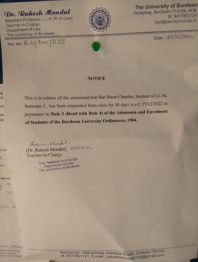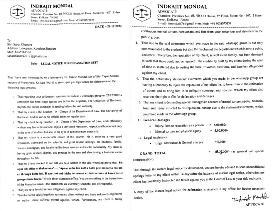 গত ২৬শে ডিসেম্বর বর্ধমান বিশ্ববিদ্যালয়ের আইন বিভাগে এলএলএম (স্নাতকোত্তর)-এর প্রথম সেমেস্টারের ছাত্র সনৎ চন্দ্রকে দশ লক্ষ পাঁচ হাজার টাকার মানহানি মামলার নোটিশ পাঠালেন তাঁরই বিভাগের টিচার-ইন-চার্জ রাকেশ মণ্ডল। সঙ্গে এও বলা হয়েছে যে আগামী ১৪ দিনের মধ্যে সনৎ নিঃশর্ত ক্ষমা না চাইলে অধ্যাপক রাকেশ মণ্ডল সনৎ চন্দ্রের বিরুদ্ধে মামলা করবেন।
