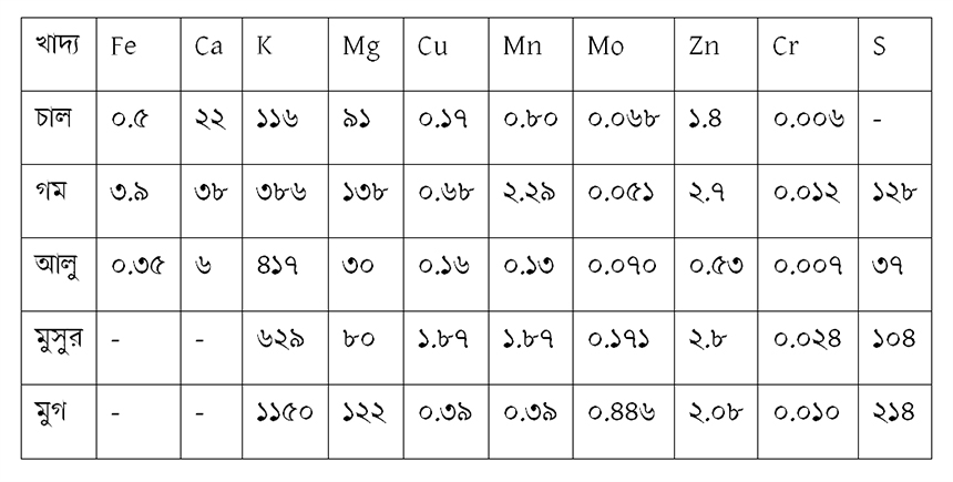 খাদ্যে উপস্থিত বিভিন্ন মৌলিক পদার্থের পরিমাণ (মি.গ্রা./১০০গ্রামে)