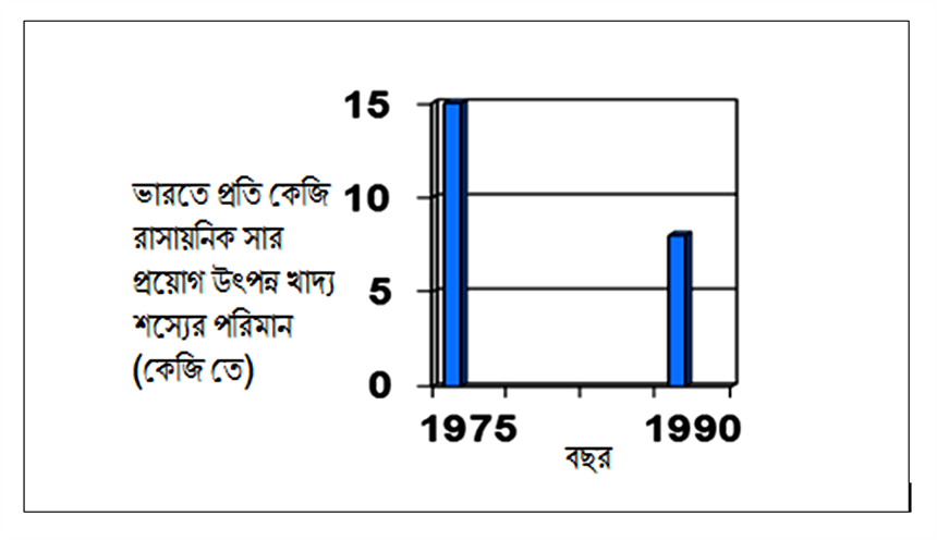 এই সমস্ত কারণে যেখানে ১৯৭৫ সালে সর্ব ভারতীয় ক্ষেত্রে গড়ে প্রতি কেজি রাসায়নিক সার প্রয়োগে ১৫ কেজি খাদ্যশস্য উৎপাদিত হত সেখানে ১৯৯০ সালে হয়েছিল মাত্র ৮ কেজি১৬ (চিত্র-২ দ্রষ্টব্য)।
