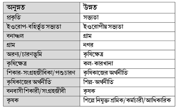 সারণির দুদিকের মধ্যে একদিককে “অনুন্নত” আর অপরদিককে “উন্নত” বলে নির্ধারণ করার মধ্য দিয়ে যেমন দুদিককে একটা আপেক্ষিক তুলনামূলক নিকৃষ্ট-প্রকষ্ট সম্পর্কে বাঁধা হয় (যেমন: সভ্যতার তুলনায় প্রকৃতি নিক্ষ্ট, ইওরোপীয় সভ্যতার তুলনায় ইওরোপ-বহির্ভূত সভ্যতা নিকৃষ্ট, ইত্যাদি) তেমনই কাঙ্খিত পরিবর্তন বা বিবর্তনের একটি ক্রমকে স্বাভাবিক হিসেবে হাজির করা হয় (যেমন: প্রকৃতির উপর নিয়ন্ত্রণ/আধিপত্য কায়েম করে সভ্যতায় ‘বিবর্তিত’ হওয়া, ইওরোপ বহির্ভূত সভ্যতা থেকে বিবর্তিত হয়ে ইওরোপীয় সভ্যতায় “উন্নত” হওয়া ইত্যাদি)। এই পরিবর্তন বা বিবর্তনের একধরনের ক্রম হাজির হয়, যেমন: