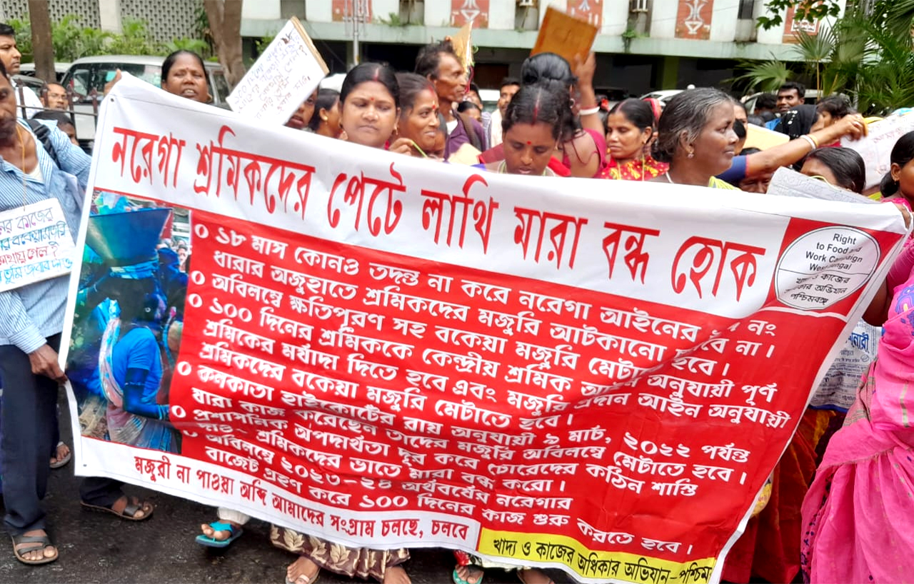 প্রসঙ্গত, ৬ জুন কলকাতা হাই কোর্টের প্রধান বিচারপতির ডিভিশন বেঞ্চ পশ্চিমবঙ্গ খেতমজুর সমিতির করা এক মামলার রায়ে প্রকৃত মজুরদের চিহ্নিত করে তাঁদের মজুরি অবিলম্বে মিটিয়ে দেওয়ার নির্দেশ দিয়েছিল। খাদ্য ও কাজের অভিযান—পশ্চিমবঙ্গ’র আরও অভিযোগ, ২০২১ সালের ডিসেম্বর মাস থেকে মে ২০২৩ পর্যন্ত শ্রমিকদের বকেয়া মজুরির পরিমাণ ২,৭৬৫ কোটি টাকা। গত ১৮ মাস ধরে এই টাকা বকেয়া পড়ে রয়েছে। পাশাপাশি, ২০২২-২৩ ও ২০২৩-২৪ অর্থবর্ষে নারেগা খাতে কোনও অর্থ বরাদ্দ করা হয়নি। রাজ্য সরকারের বিরুদ্ধে পঞ্চায়েতে দুর্নীতির অভিযোগ এনে এই বরাদ্দ বন্ধ রেখেছে কেন্দ্রীয় পঞ্চায়েত ও গ্রামোন্নয়ন মন্ত্রক। শুধু তাই নয়, ১০০ দিনের কাজের শ্রমিকদের সমস্ত আইনি অধিকার লঙ্ঘন করে চলেছে কেন্দ্রীয় সরকার। যেমন, মজুরি দিতে দেরি করা, সরকার ঘোষিত ন্যূনতম মজুর না দেওয়া এবং অন্যান্য আইনি সুবিধা থেকে বঞ্চিত রাখা।