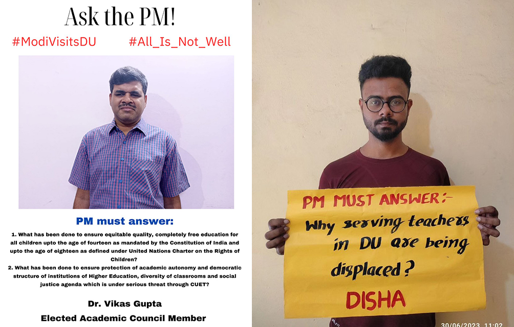 The teachers and student organisations of Delhi University took to social media (FB, Twitter and Instagram) with the hashtags #ModiVisitsDU and #All_Is_Not_Well to demand urgent attention to burning questions that plague the University as well as the country. The teachers and students raised important issues such as: the implementation of the FYUP with no grants, the withdrawal of grants and forcing universities to take loans from HEFA, the NEP and it’s fallout of increasing costs due to commercialization of education, the manner in which hundreds of serving ad-hoc teachers have been displaced from their jobs, the CUET which has further marginalized those who already found it difficult to make it to higher education, Old Pension Scheme for all, grants for releasing arrears and pensions to teachers.