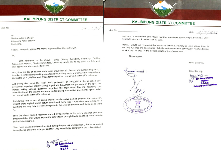১১ অক্টোবর কালিম্পং থানায় দুটি আলাদা আলাদা অভিযোগ দায়ের করেন দার্জিলিং জেলার সোনাদার প্রবীণ সুব্বা ও টুং-এর অনুপ ঠাকুরি। প্রবীণের অভিযোগ, ওই দুই সাংবাদিক সুব্বা জনজাতির নামে গালমন্দ করেছে এবং তাঁকে অপমান করেছে। অনুপ ঠাকুরির দাবি, সাংবাদিকরা লাঠি, খুকরি নিয়ে তার উপর হামলা চালায় এবং মেরে ফেলার হুমকি দেয়। সম্ভবত, দুই অভিযোগ যথেষ্ট নয় বলে মনে হওয়ায় বিজিপিএম-এর কালিম্পং জেলা কমিটির সভাপতি দলীয় প্যাডে কালিম্পং থানার আইসি-কে লেখা চিঠিতে ওই দুই সাংবাদিকের বিরুদ্ধে তফসিলি জাতি-জনজাতি আইনে গ্রেফতার করার দাবি জানায়।