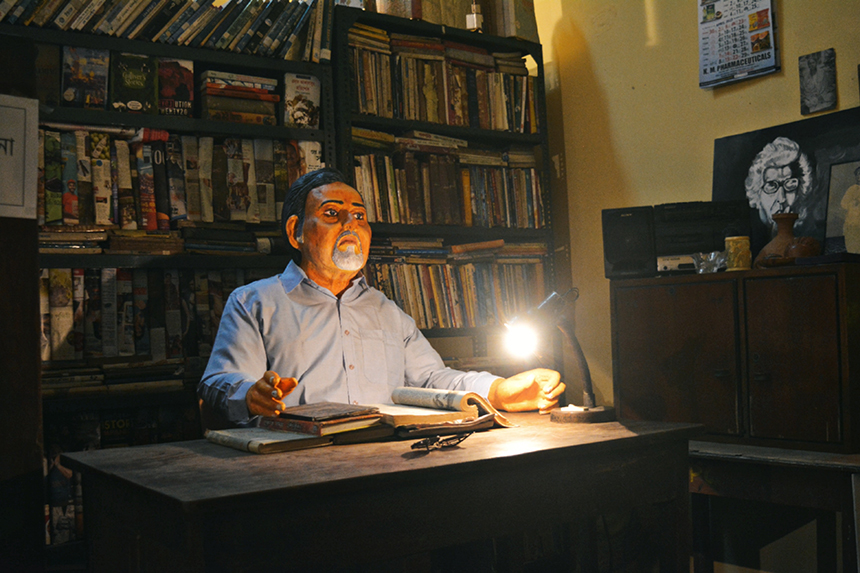 মণ্ডপের লাইব্রেরি ঘরটিকে লাইব্রেরির রূপ দিতে সংগ্রহ করা হয়েছে কয়েক হাজার বই। “আমরা প্রথম চেষ্টা করেছিলাম লিটল ম্যাগাজিন সংগ্রহ করতে। কিন্তু পুজো মণ্ডপে সন্দীপবাবুর লাইব্রেরি থেকে এতো ম্যাগাজিন নিয়ে আসাটা বড্ড ঝুঁকিপূর্ণ কাজ। তাই আমরা কলেজ স্ট্রিট, গড়িয়াহাট থেকে, বিভিন্ন পুরনো বইয়ের দোকান থেকে, বিভিন্ন লাইব্রেরি থেকে, আমাদের নিজেদের লাইব্রেরি থেকে এমনকি যারা কাগজ বিক্রি করেন বড় বড় হোলসেলার তাদের থেকেও বই কিনে এনে আমরা লাইব্রেরিটা সাজিয়েছি। গত একমাস ধরে এই বই সংগ্রহের কাজটা চলেছে। লিটল ম্যাগাজিনের পাশাপাশি একটা চিন্তাকে আমরা সাধারণ মানুষের মধ্যে ছড়িয়ে দিতে চেয়েছি যেটা হল বই পড়ার ভাবনা। আমাদের পুথি থেকে বই পড়ার যে হাজার বছরের ইতিহাস তাকে একরকম চ্যালেঞ্জের মুখে ফেলে দিয়েছে ডিজিটাল মাধ্যমগুলি। আমরা চাই মানুষ বই পড়ুক। লিটল ম্যাগাজিন পড়ুক, সন্দীপ দত্তকে চিনুক” বলেন কৃষ্ণগোপাল মল্লিক।