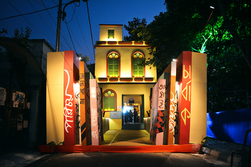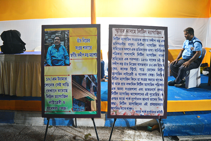 পুজো মণ্ডপে ঢোকার আগেই বড় একটা হোর্ডিংয়ের দিকে চোখ যায় যেখানে লেখা ‘স্মৃতির আবহে লিটল ম্যাগাজিন’ এবং সঙ্গে সন্দীপ দত্তের ছবি। এরপর মূল মণ্ডপের প্রবেশদ্বারে লিটল ম্যাগাজিন হিসেবে খ্যাত বেশকিছু পত্রিকার নাম। প্রবেশদ্বার পেরিয়েই একটা প্যাসেজ যেখানে ১৯১৪ সালে প্রথম প্রকাশিত লিটল ম্যাগাজিন ‘সবুজপত্র’ (বিতর্কিত) থেকে শুরু করে বর্তমানের এই দীর্ঘ যাত্রাপথকে সাজিয়ে তোলা হয়েছে। পুজো প্যান্ডেলটি গড়ে তোলা হয়েছে সন্দীপ দত্ত প্রতিষ্ঠিত টেমার লেনের লিটল ম্যাগাজিন লাইব্রেরি ও গবেষণা কেন্দ্রের আদলে। লাইব্রেরির আদলেই আরেকটি লাইব্রেরি গড়ে তোলা হয়েছে মণ্ডপের ভিতরে যেখানে একটি টেবিলে সন্দীপ দত্তের আবক্ষ মূর্তি, সামনে টেবিল ল্যাম্প ও পত্রিকা। যেন স্বয়ং সন্দীপ দত্ত নিজের কাজে ব্যস্ত।