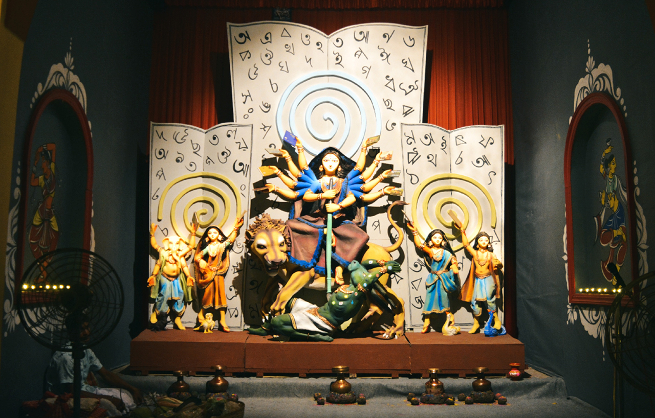 দুর্গা প্রতিমা যেখানে সেই স্থানটি সাজানো হয়েছে বিভিন্ন লিটল ম্যাগাজিনের রেপ্লিকা দিয়ে। এখানে দুর্গা প্রতিমার হাতে ত্রিশূল নেই, আছে কলম। অন্যান্য হাতে বই। কলম দিয়েই অসুর বধ করছেন দুর্গা। কার্তিক, গণেশ, সরস্বতী, লক্ষ্মী সকলের হাতেই বই। ফেসবুক, ইনস্টাগ্রাম, এক্স (পূর্বতন টুইটার)-সহ ডিজিটাল মাধ্যমগুলি এখানে অসুররূপী। সমগ্র পুজো মণ্ডপটি নিজেদের হাতে সাজিয়েছেন সন্দীপ সাহা ও সুজিত সেন। উদ্যোক্তা কৃষ্ণগোপাল মল্লিক জানাচ্ছেন, “আমরা এর আগে থিম পুজো করতাম না, সাবেকি পুজোই করে এসেছি বরাবর। এবারেই প্রথম থিম পুজোর ভাবনা।” বাংলা সাহিত্যের ভান্ডার সুবিশাল। তার মধ্যে লিটল ম্যাগাজিনই কেন বেছে নেওয়া হল? এ-প্রশ্নের জবাবে তিনি বলেন, “আমরা যখন সাহিত্য চর্চা করতাম তখন আমরা দেখেছিলাম লিটল ম্যাগাজিন হল প্রতিবাদের ভাষা। ভালো ভালো লেখক তৈরি হয়েছে এই লিটল ম্যাগাজিন থেকে। লিটল ম্যাগাজিন হল আমার মতে সাহিত্যের বীজ।”