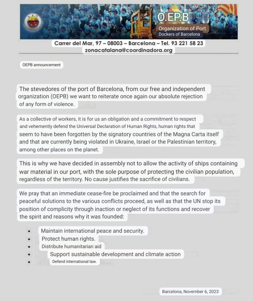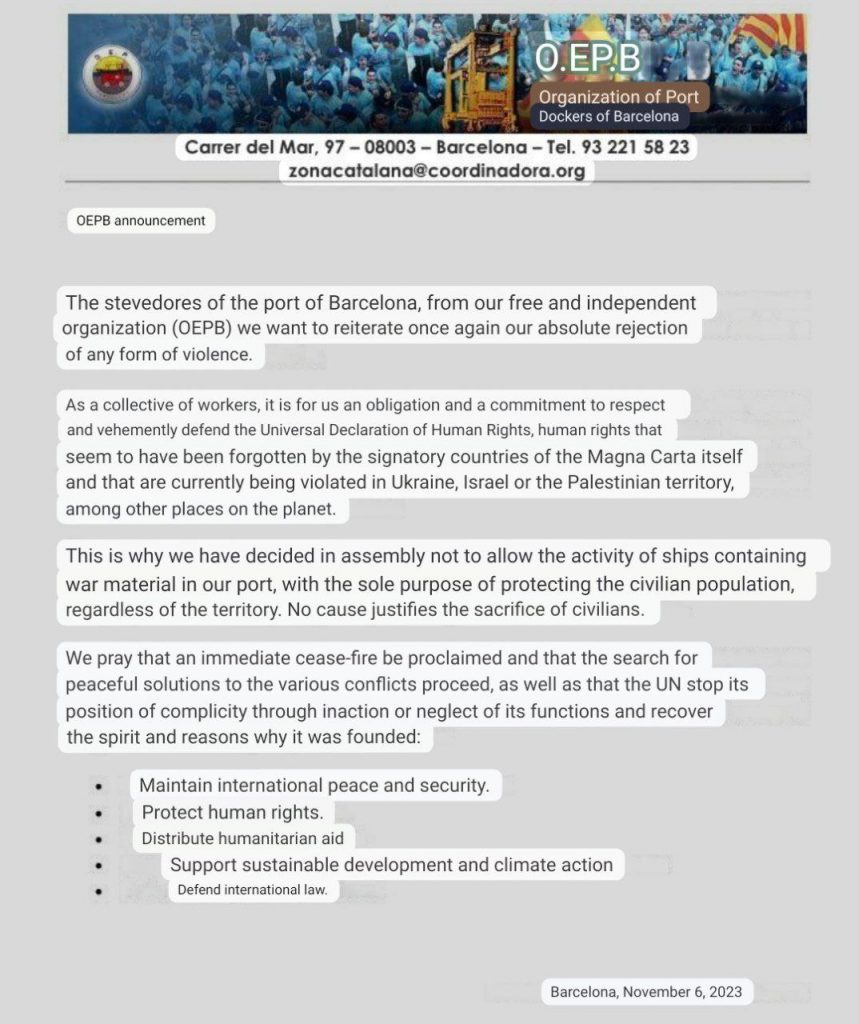 On Monday, 6 November, 2023, the Organization of Port Dockers in Barcelona (OEPB), the largest union of dock workers in the city, called for a cease-fire to the war in Gaza and announced that they will refuse to handle the shipment of any weapons, citing humanitarian concerns. “Workers have committed to not load, unload, or facilitate the tasks of any boat containing weapons,” the Spanish publication El Diario reported