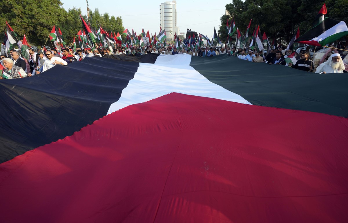 People hold a big Palestinian flag during a rally against Israeli airstrikes on Gaza, on International Palestinian Solidarity Day, in Karachi on November 29, 2023.