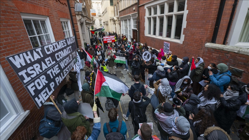 A group of protesters demonstrated in London to “shut down” the Fisher German property consultancy company for its ties to Israeli-owned weapons manufacturer Elbit Systems. The crowd, carrying Palestinian flags, accused Fisher German of renting sites to Elbit Systems, which they accused of “committing genocide.”