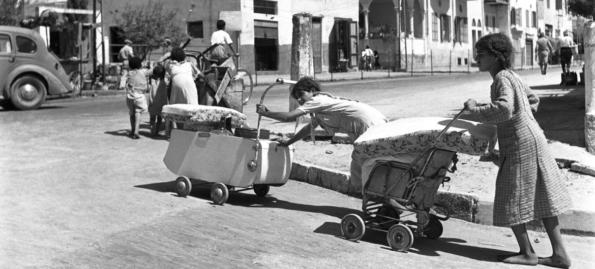 UN Photo: Barefoot and pushing their belongings in prams and carts, Arab families leave the coastal town of Jaffa which became part of the greater Tel Aviv area in the state of Israel.