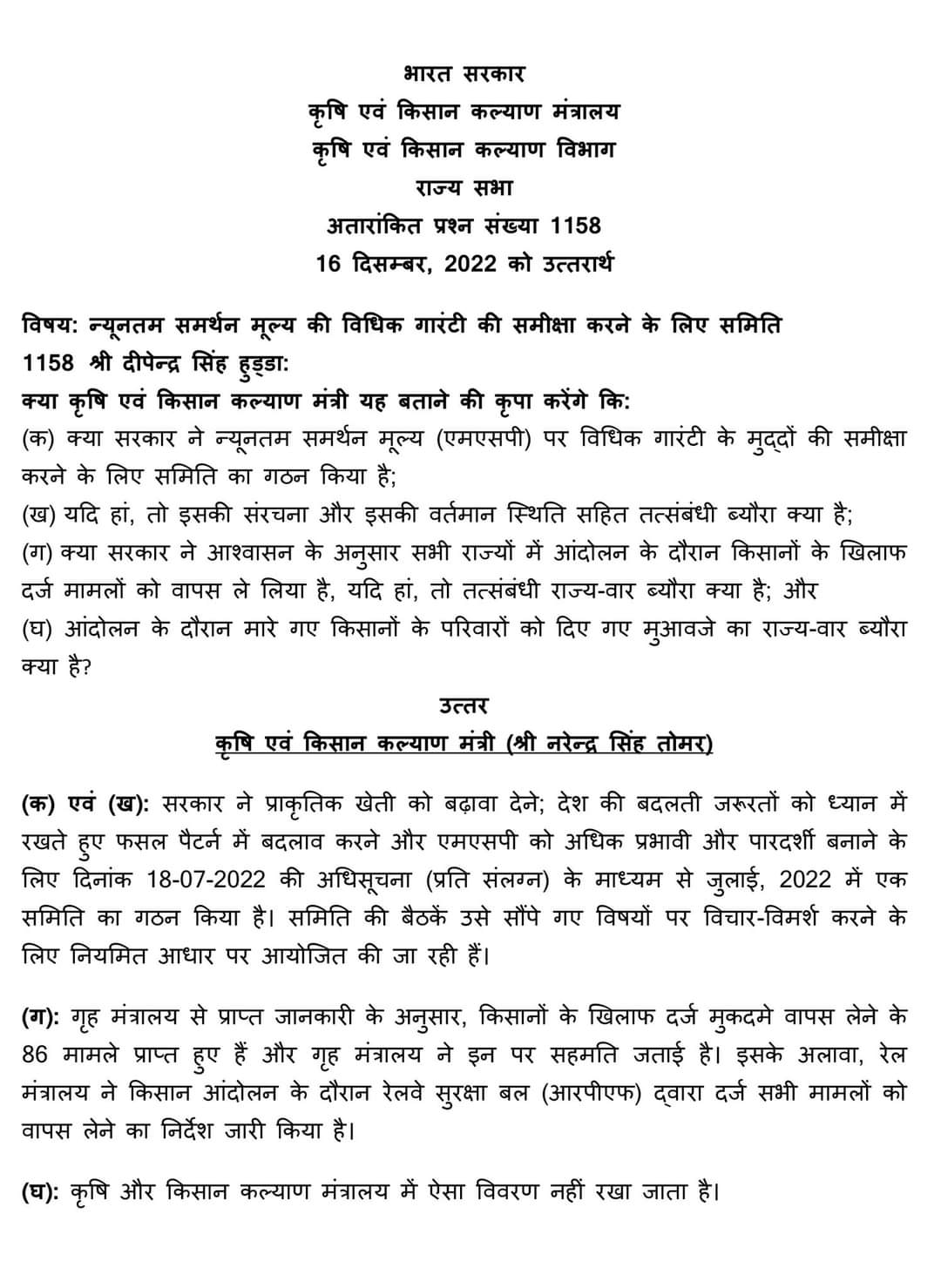 2) In the answer to Question No. 1158 dated 19th December 2022 raised in the Rajya Sabha, Minister of Agriculture and Farmer’s Welfare Narendra Singh Tomar had replied that as per the reports received in the Home Ministry, the proposal to withdraw 86 cases against farmers have come up and the Home Ministry has permitted to do so. Apart from this, the Railway Ministry has given direction to withdraw all cases registered against farmers by the Railway Protection Force. (Answer Attached)