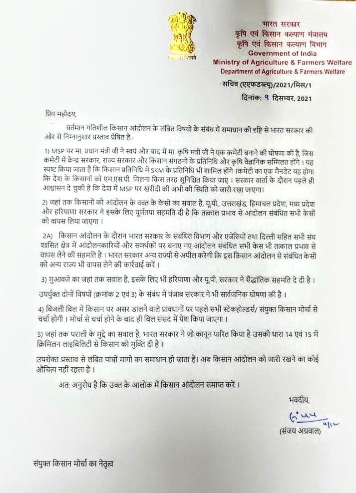 1) the Union Govt. through a letter dated 9th December 2021 signed by Sanjay Aggarwal, Secretary to Ministry of Agriculture and Farmers Welfare, had categorically stated that the state governments of Uttar Pradesh, Uttarakhand, Himachal Pradesh, Madhya Pradesh and Haryana have fully agreed to immediately withdraw all the cases related with the Farmers’ Struggle. Further, the Union Govt. and its agencies and administrations of Union Territories had also agreed to withdraw all cases related to Farmers’ struggle and the Union Govt. would request all other state governments too to withdraw cases against the Farmers’ Struggle. (Letter Attached)