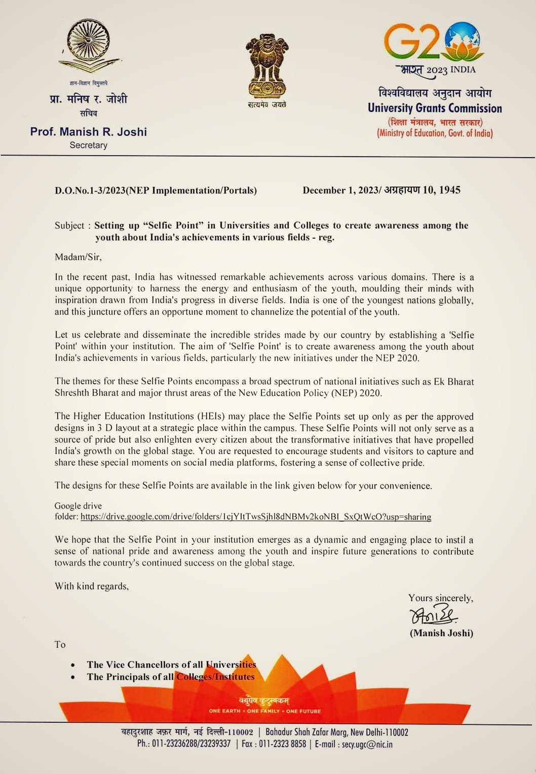 The images to be used in the selfie point are available in the Google Drive in the notification. In the letter, the UGC has come up with various design themes for the selfie points. The themes include unity in diversity, the Indian knowledge system, research and innovation, and multilingualism, among others.