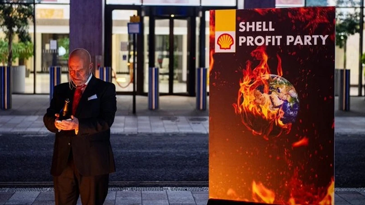 Cover Image: A protester pretends to celebrate outside Shell’s London headquarters. (Photo: Greenpeace U.K./X)