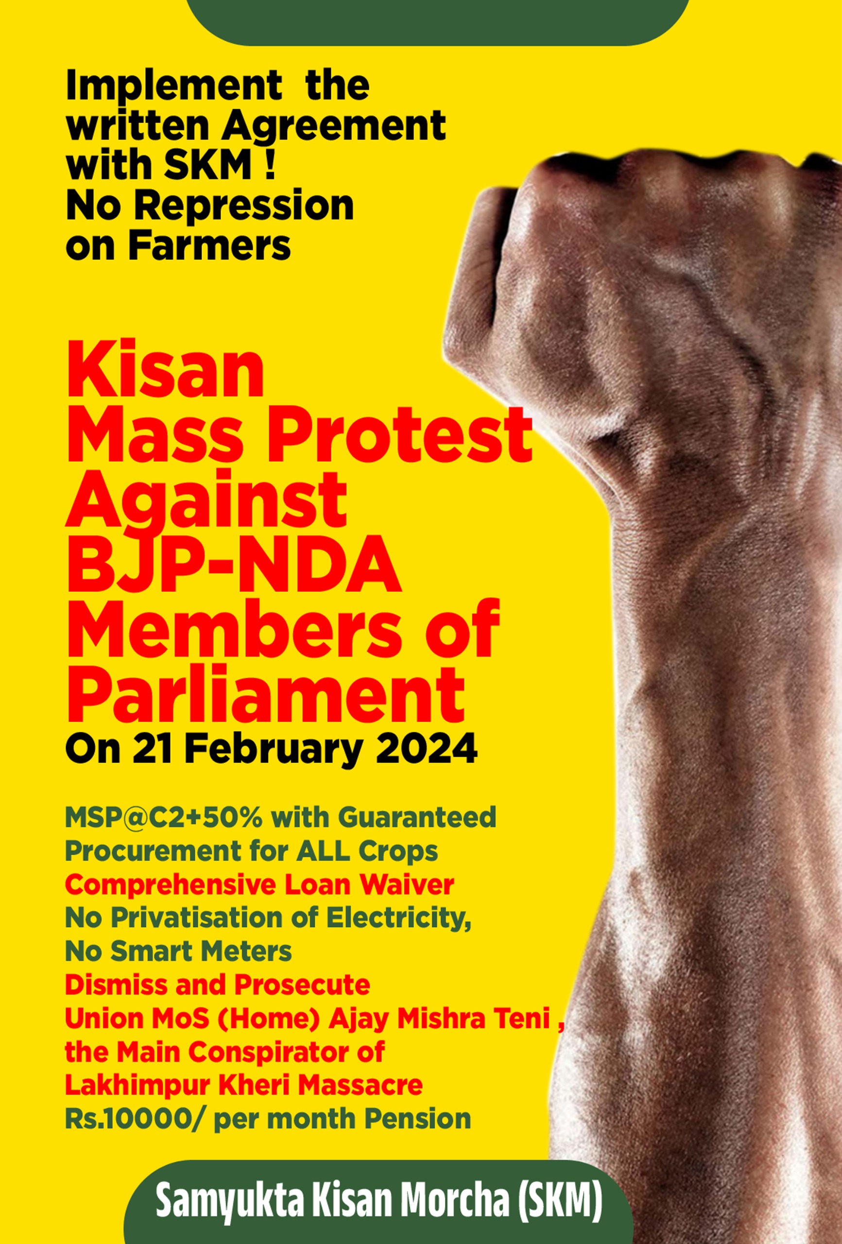 The Samyukta Kisan Morcha (SKM) that led the historic year-long movement against the three farm laws in 2020-21, has stayed away from the ongoing ‘Delhi chalo’ movement so far, but held protest demonstrations on 21 February against the Members of Parliament of BJP and NDA in all district headquarters with the demands of implementing the agreement with SKM on 9th December 2021 and to stop state repression of ongoing farmers’ agitation at Punjab borders on the same demands.