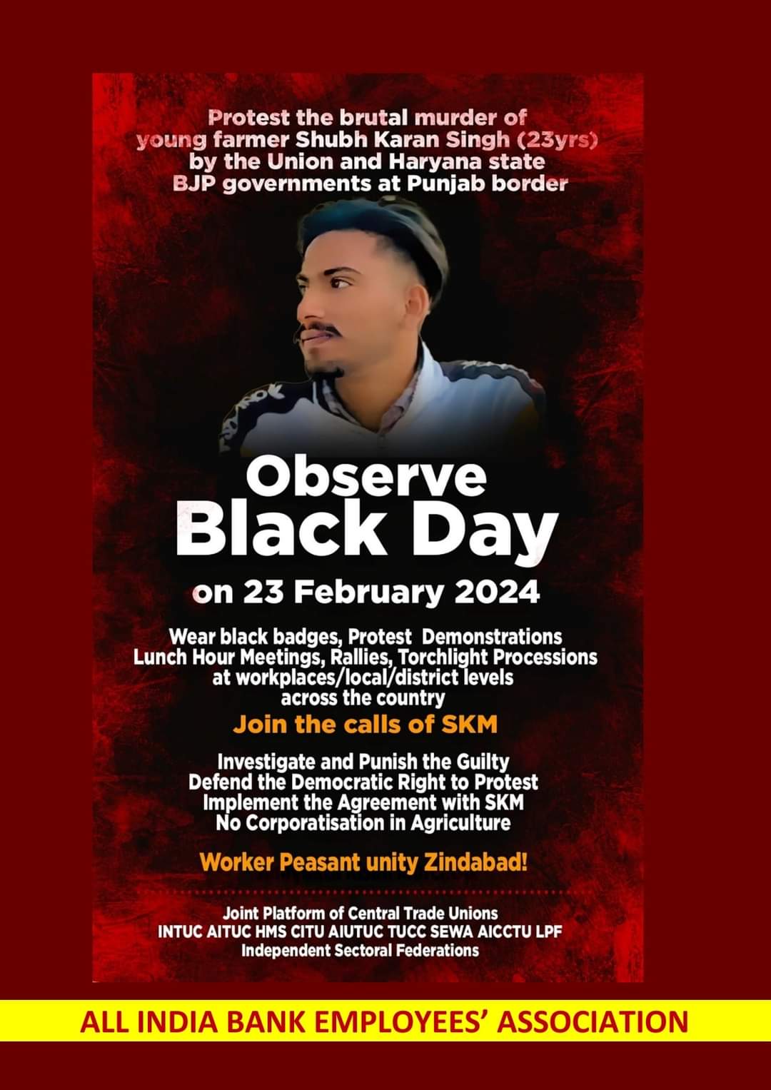 The CTUs have called upon the unions of all sectors — organised and unorganized — to observe 23rd February as Black day and organise nationwide protests, wear black badges, have lunch hour protests, protest dharnas, processions, torchlight/candlelight protests in whatever form they can express their anguish on the ruthless approach of Union government towards workers and farmers of the country.